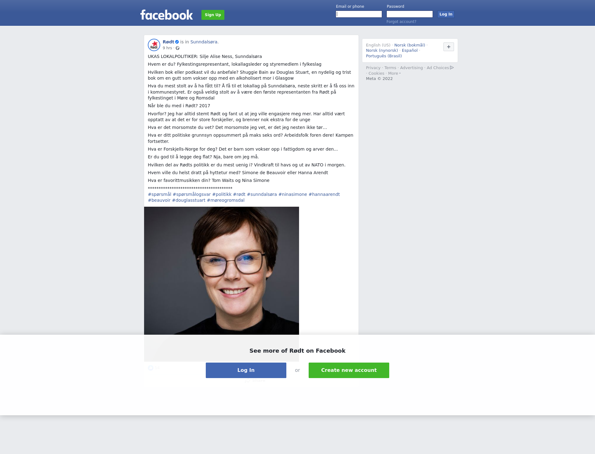 UKAS LOKALPOLITIKER: Silje Alise Ness, Sunndalsøra \n\nHvem er du? Fylkestingsrepresentant, lokallagsleder og styremedlem i fylkeslag \n\nHvilken bok eller podkast vil du anbefale? Shuggie Bain av Douglas Stuart, en nydelig og trist bok om en gutt som vokser opp med en alkoholisert mor i Glasgow \n\nHva du mest stolt av å ha fått til? Å få til et lokallag på Sunndalsøra, neste skritt er å få oss inn i kommunestyret. Er også veldig stolt av å være den første representanten fra Rødt på fylkestinget i Møre og Romsdal \n\nNår ble du med i Rødt? 2017 \n\nHvorfor? Jeg har alltid stemt Rødt og fant ut at jeg ville engasjere meg mer. Har alltid vært opptatt av at det er for store forskjeller, og brenner nok ekstra for de unge \n\nHva er det morsomste du vet? Det morsomste jeg vet, er det jeg nesten ikke tør… \n\nHva er ditt politiske grunnsyn oppsummert på maks seks ord? Arbeidsfolk foren dere! Kampen fortsetter.\n\nHva er Forskjells-Norge for deg? Det er barn som vokser opp i fattigdom og arver den... \n\nEr du god til å legge deg flat? Nja, bare om jeg må. \n\nHvilken del av Rødts politikk er du mest uenig i? Vindkraft til havs og ut av NATO i morgen. \n\nHvem ville du helst dratt på hyttetur med? Simone de Beauvoir eller Hanna Arendt \n\nHva er favorittmusikken din? Tom Waits og Nina Simone\n\n*************************************** \n#spørsmål #spørsmålogsvar #politikk #rødt #sunndalsøra #ninasimone #hannaarendt #beauvoir #douglasstuart #møreogromsdal