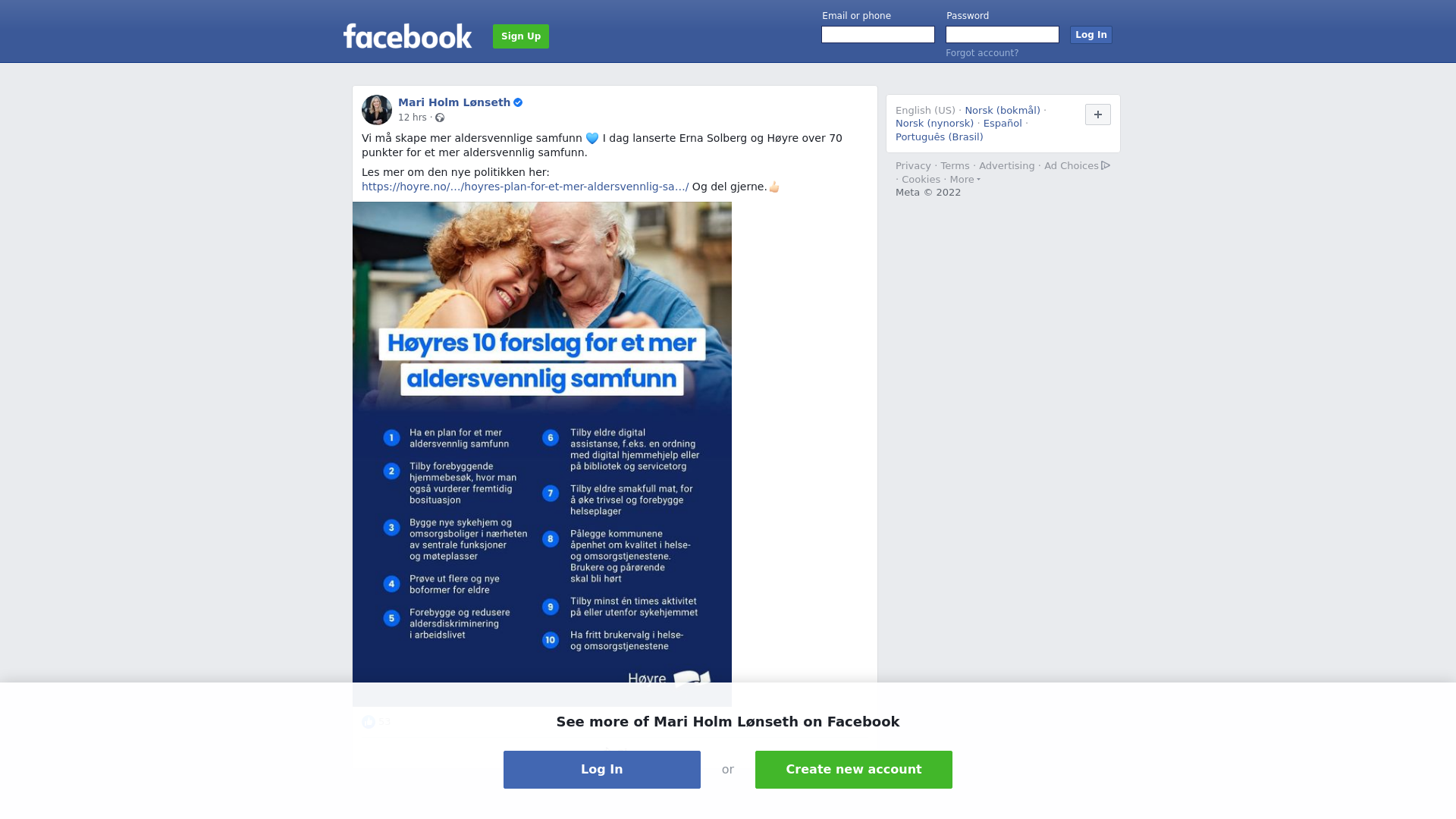 Vi må skape mer aldersvennlige samfunn 💙 I dag lanserte Erna Solberg og Høyre over 70 punkter for et mer aldersvennlig samfunn. \n\nLes mer om den nye politikken her: \nhttps://hoyre.no/2022/09/02/hoyres-plan-for-et-mer-aldersvennlig-samfunn/ Og del gjerne.👍🏻