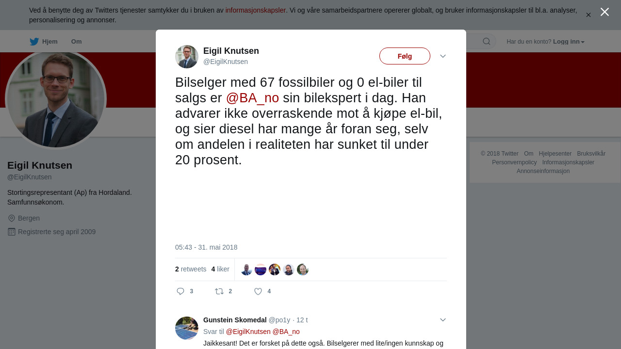 Bilselger med 67 fossilbiler og 0 el-biler til salgs er @BA_no sin bilekspert i dag. Han advarer ikke overraskende mot å kjøpe el-bil, og sier diesel har mange år foran seg, selv om andelen i realiteten har sunket til under 20 prosent.