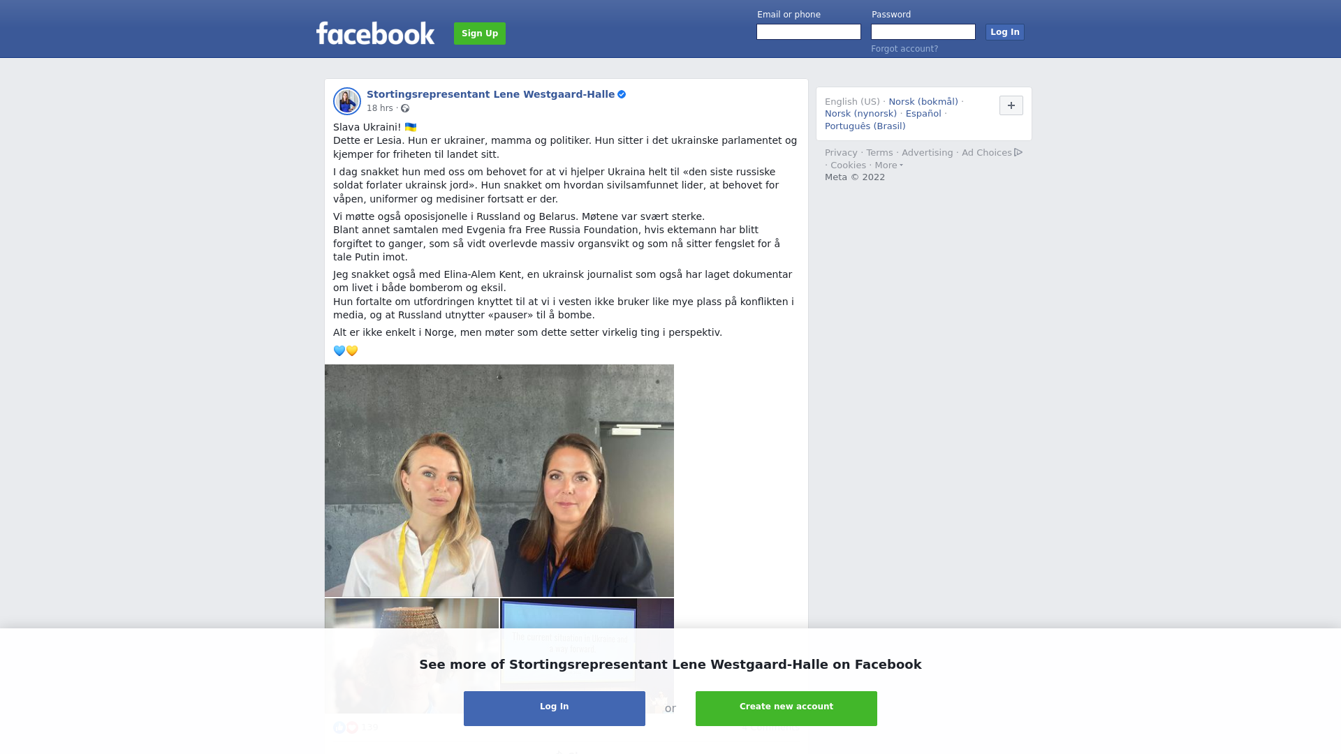Slava Ukraini! 🇺🇦\nDette er Lesia. Hun er ukrainer, mamma og politiker. Hun sitter i det ukrainske parlamentet og kjemper for friheten til landet sitt.\n\nI dag snakket hun med oss om behovet for at vi hjelper Ukraina helt til «den siste russiske soldat forlater ukrainsk jord». Hun snakket om hvordan sivilsamfunnet lider, at behovet for våpen, uniformer og medisiner fortsatt er der.\n\nVi møtte også oposisjonelle i Russland og Belarus. Møtene var svært sterke. \nBlant annet samtalen med Evgenia fra Free Russia Foundation, hvis ektemann har blitt forgiftet to ganger, som så vidt overlevde massiv organsvikt og som nå sitter fengslet for å tale Putin imot. \n\nJeg snakket også med Elina-Alem Kent, en ukrainsk journalist som også har laget dokumentar om livet i både bomberom og eksil.\nHun fortalte om utfordringen knyttet til at vi i vesten ikke bruker like mye plass på konflikten i media, og at Russland utnytter «pauser» til å bombe.\n\nAlt er ikke enkelt i Norge, men møter som dette setter virkelig ting i perspektiv.\n\n💙💛