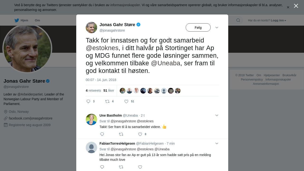 RT @jonasgahrstore: Takk for innsatsen og for godt samarbeid @estoknes, i ditt halvår på Stortinget har Ap og MDG funnet flere gode løs… https://t.co/Pa38Kuw7TA