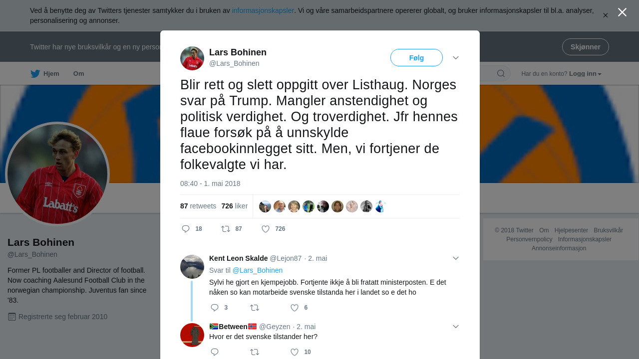 RT @Lars_Bohinen: Blir rett og slett oppgitt over Listhaug. Norges svar på Trump. Mangler anstendighet og politisk verdighet. Og trov… https://t.co/xX30HnEKqC