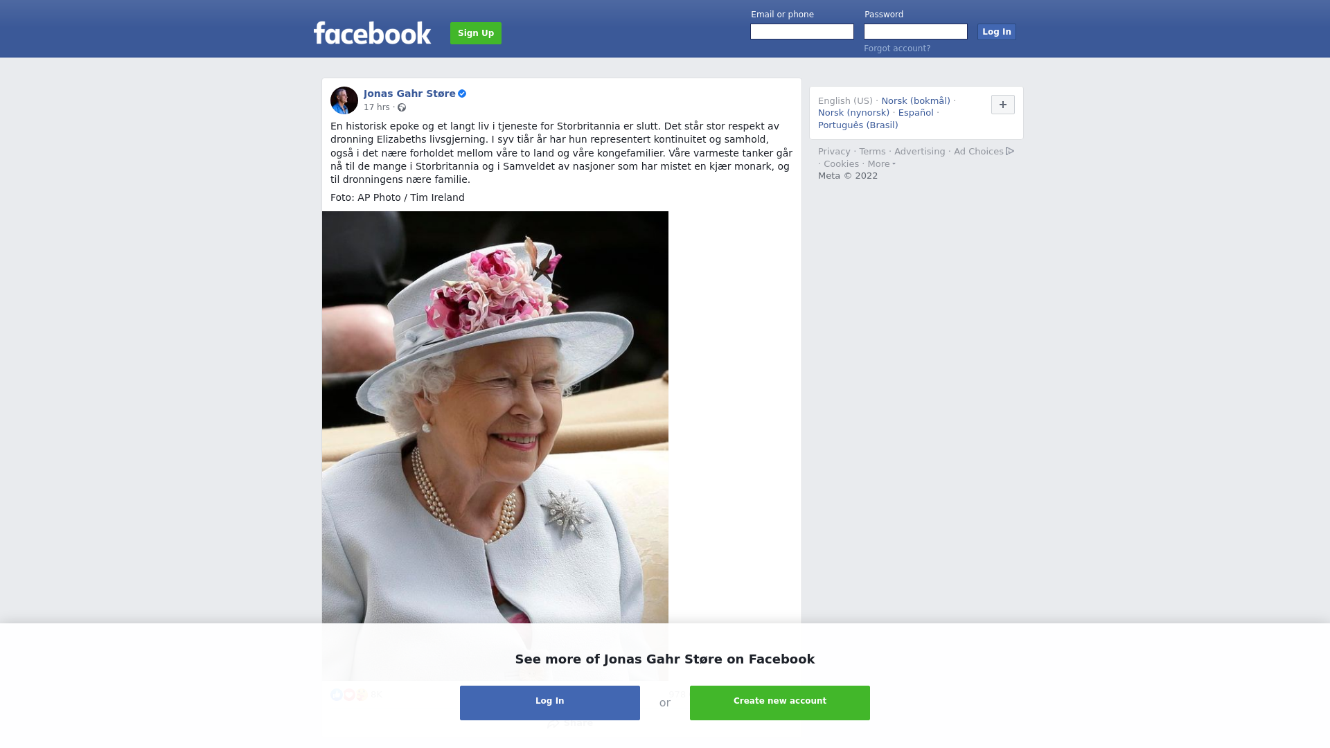 En historisk epoke og et langt liv i tjeneste for Storbritannia er slutt. Det står stor respekt av dronning Elisabeths livsgjerning. I syv tiår år har hun representert kontinuitet og samhold, også i det nære forholdet mellom våre to land og våre kongefamilier. Våre varmeste tanker går nå til de mange i Storbritannia og i Samveldet av nasjoner som har mistet en kjær monark, og til dronningens nære familie.\n\nFoto: AP Photo / Tim Ireland