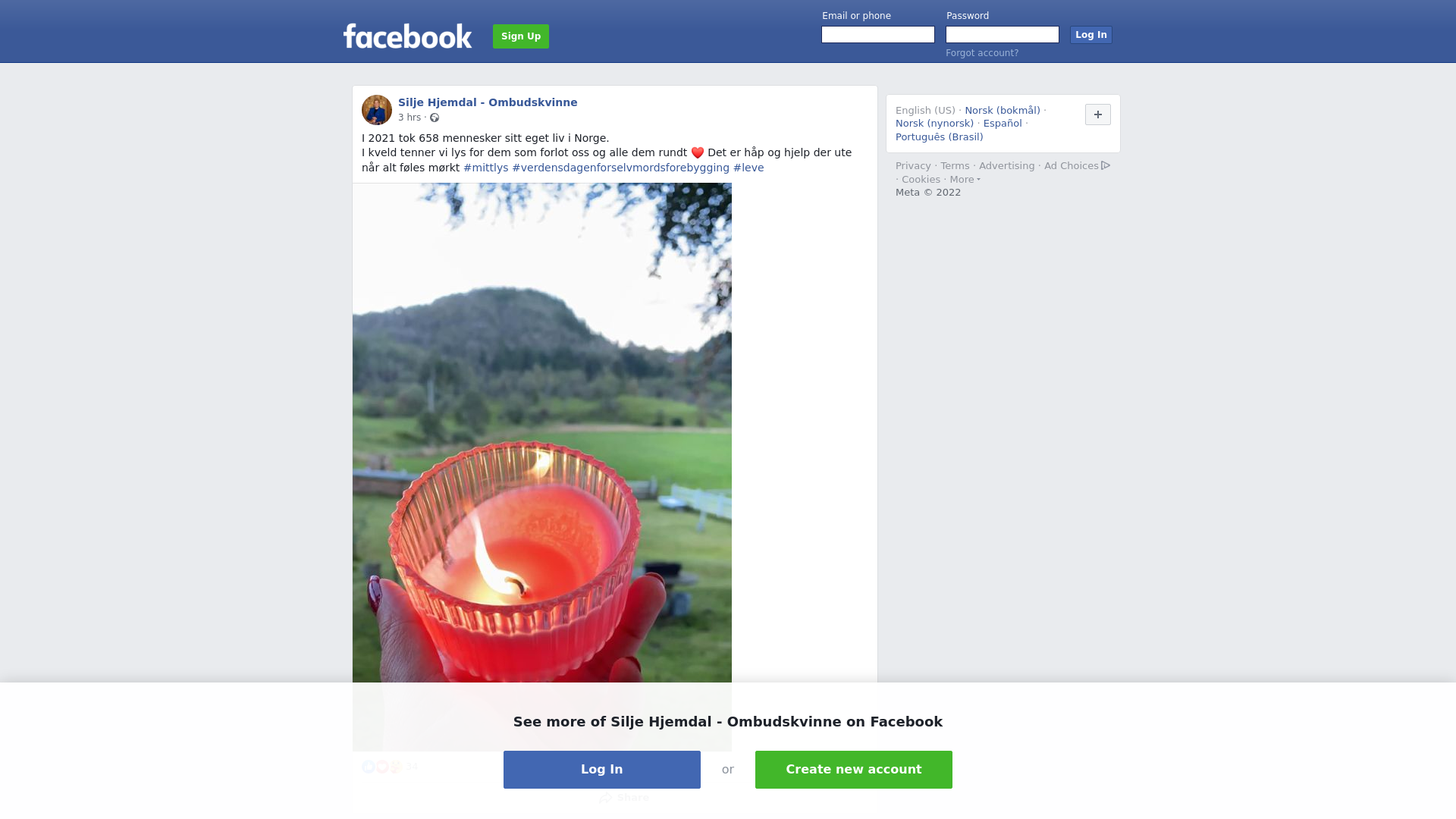 I 2021 tok 658 mennesker sitt eget liv i Norge. \nI kveld tenner vi lys for dem som forlot oss og alle dem rundt ❤️ Det er håp og hjelp der ute når alt føles mørkt #mittlys #verdensdagenforselvmordsforebygging #leve
