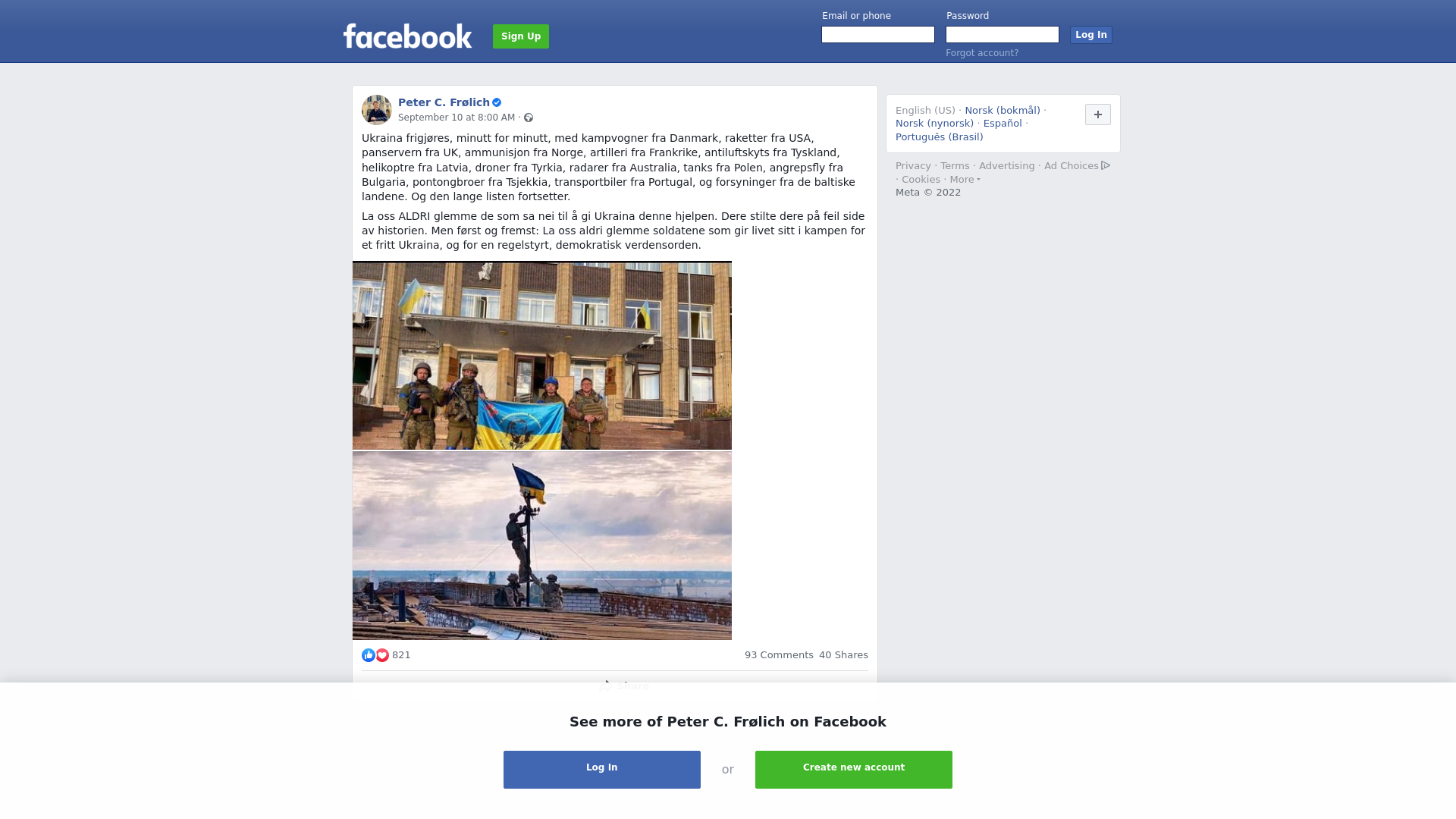 Ukraina frigjøres, minutt for minutt, med kampvogner fra Danmark, raketter fra USA, panservern fra UK, ammunisjon fra Norge, artilleri fra Frankrike, antiluftskyts fra Tyskland, helikoptre fra Latvia, droner fra Tyrkia, radarer fra Australia, tanks fra Polen, angrepsfly fra Bulgaria, pontongbroer fra Tsjekkia, transportbiler fra Portugal, og forsyninger fra de baltiske landene. Og den lange listen fortsetter.\n\nLa oss ALDRI glemme de som sa nei til å gi Ukraina denne hjelpen. Dere stilte dere på feil side av historien. Men først og fremst: La oss aldri glemme ukrainerne som gir livet sitt i kampen for et fritt Ukraina, og for en regelstyrt, demokratisk verdensorden.