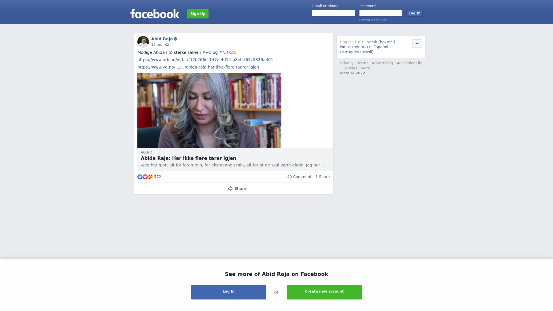 Modige Abida i to sterke saker i #VG og #NRK🫶🏽\n\nhttps://www.nrk.no/video/4f7b266d-147e-4d14-b8eb-f64c5339a401\n\nhttps://www.vg.no/nyheter/innenriks/i/76lzAK/abida-raja-har-ikke-flere-taarer-igjen