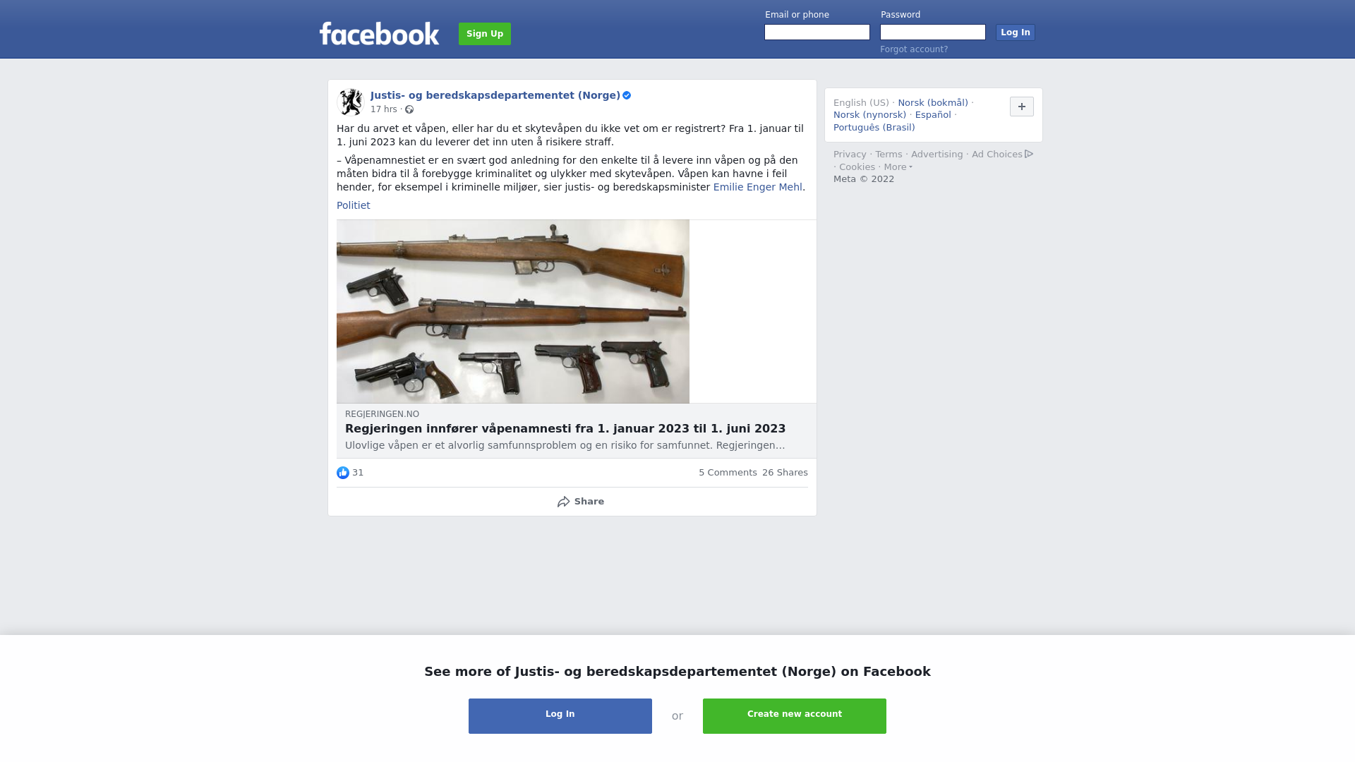 Ulovlige våpen er et alvorlig samfunnsproblem og en risiko for samfunnet. Regjeringen innfører derfor våpenamnesti fra 1. januar 2023 til 1. juni 2023.