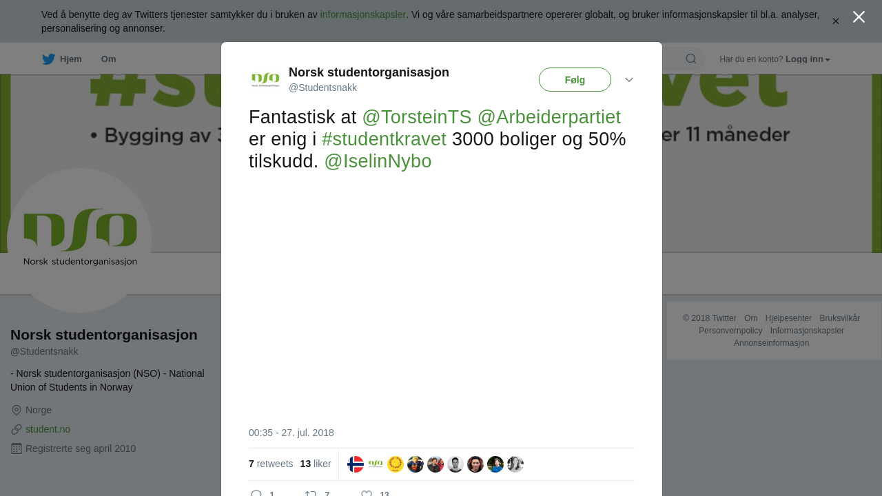 RT @Studentsnakk: Fantastisk at @TorsteinTS @Arbeiderpartiet er enig i #studentkravet 3000 boliger og 50% tilskudd. @IselinNybo https://t.co/rgaIDdNNmG