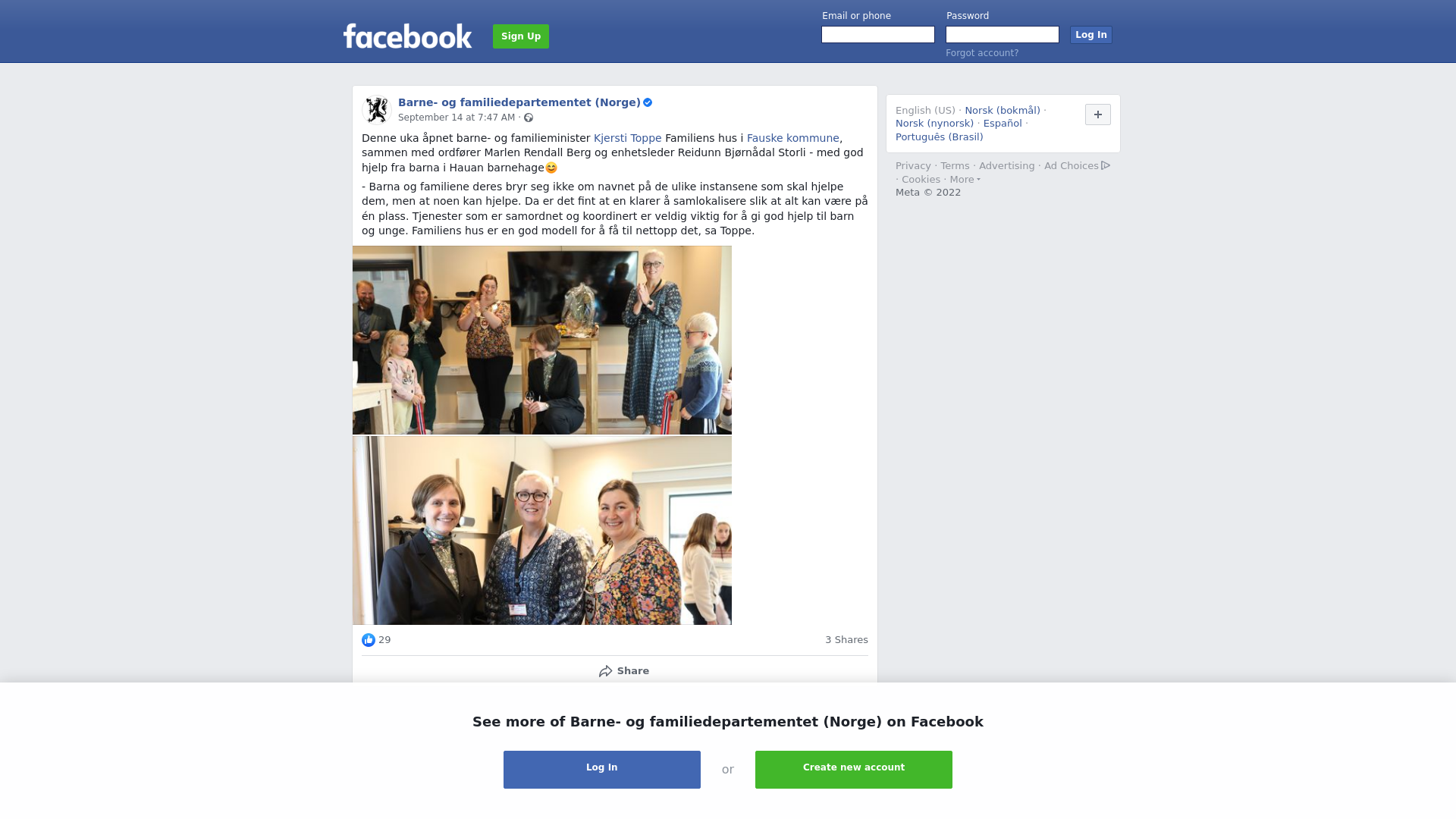 Denne uka åpnet barne- og familieminister Kjersti Toppe Familiens hus i Fauske kommune, sammen med ordfører Marlen Rendall Berg og enhetsleder Reidunn Bjørnådal Storli - med god hjelp fra barna i Hauan barnehage😊\n \n- Barna og familiene deres bryr seg ikke om navnet på de ulike instansene som skal hjelpe dem, men at noen kan hjelpe. Da er det fint at en klarer å samlokalisere slik at alt kan være på én plass. Tjenester som er samordnet og koordinert er veldig viktig for å gi god hjelp til barn og unge. Familiens hus er en god modell for å få til nettopp det, sa Toppe.