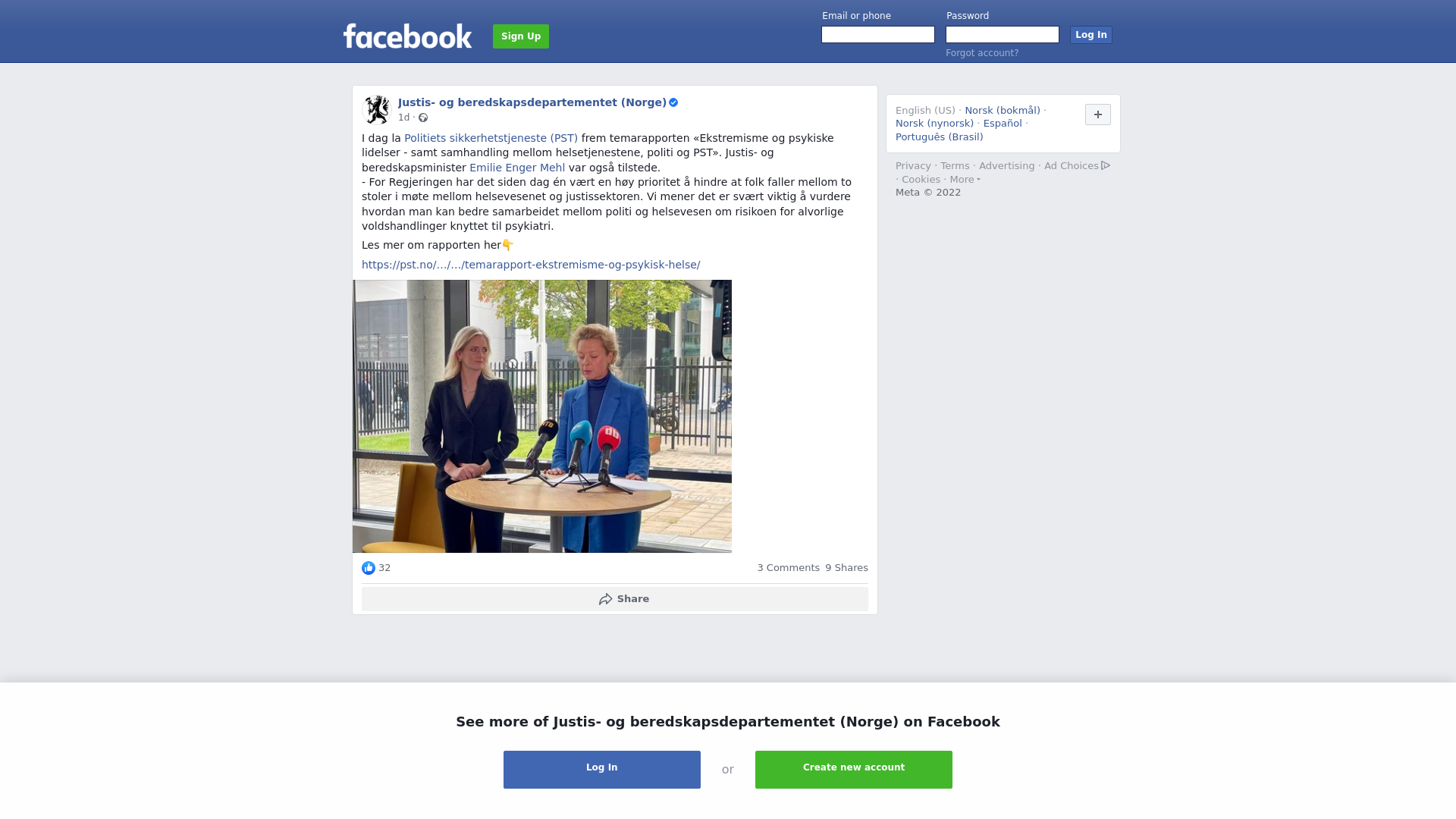 I dag la Politiets sikkerhetstjeneste (PST) frem temarapporten «Ekstremisme og psykiske lidelser - samt samhandling mellom helsetjenestene, politi og PST». Justis- og beredskapsminister Emilie Enger Mehl var også tilstede. \n- For Regjeringen har det siden dag én vært en høy prioritet å hindre at folk faller mellom to stoler i møte mellom helsevesenet og justissektoren. Vi mener det er svært viktig å vurdere hvordan man kan bedre samarbeidet mellom politi og helsevesen om risikoen for alvorlige voldshandlinger knyttet til psykiatri. \n\nLes mer om rapporten her👇\n\nhttps://pst.no/alle-artikler/pressemeldinger/temarapport-ekstremisme-og-psykisk-helse/