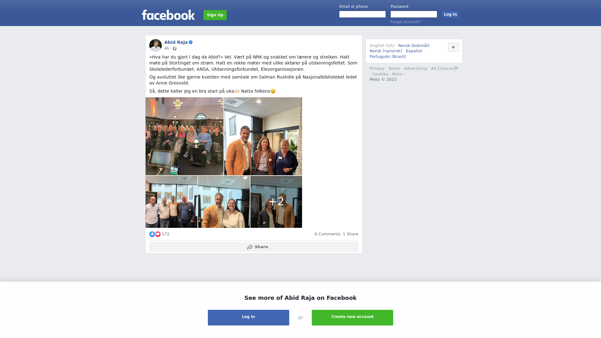 «Hva har du gjort i dag da Abid?» Vel. Vært på NRK og snakket om lærere og streiken. Hatt møte på Stortinget om strøm. Hatt en rekke møter med ulike aktører på utdanningsfeltet. Som Skolelederforbundet, ANSA, Utdanningsforbundet, Elevorganisasjonen.\n\nOg avsluttet like gjerne kvelden med samtale om Salman Rushdie på Nasjonalbiblioteket ledet av Anne Grosvold.\n\nSå, dette kaller jeg en bra start på uka🫶🏽 Natta folkens😉