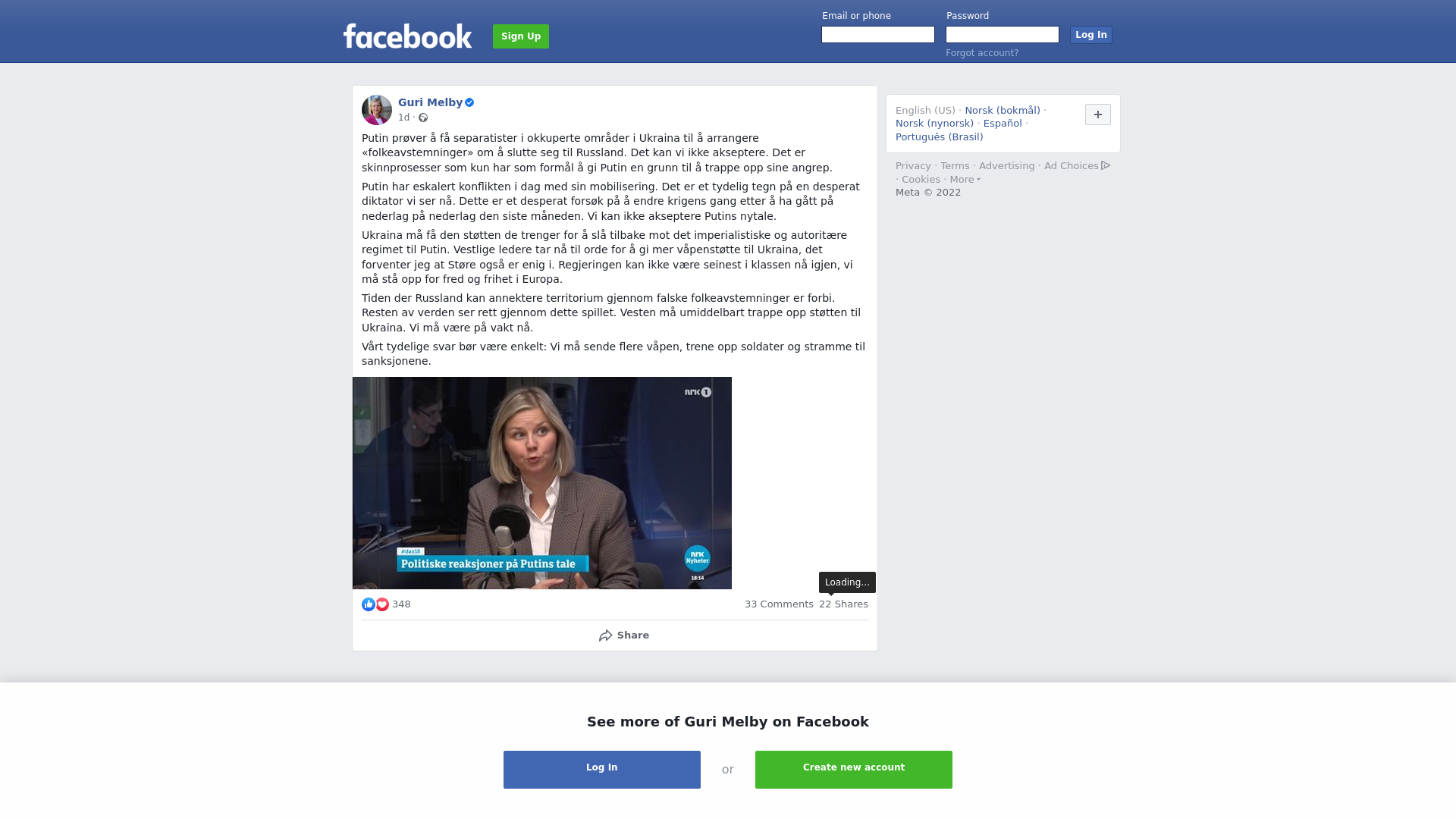 Putin prøver å få separatister i okkuperte områder i Ukraina til å arrangere «folkeavstemninger» om å slutte seg til Russland. Det kan vi ikke akseptere. Det er skinnprosesser som kun har som formål å gi Putin en grunn til å trappe opp sine angrep. \n\nPutin har eskalert konflikten i dag med sin mobilisering. Det er et tydelig tegn på en desperat diktator vi ser nå. Dette er et desperat forsøk på å endre krigens gang etter å ha gått på nederlag på nederlag den siste måneden. Vi kan ikke akseptere Putins nytale. \n\nUkraina må få den støtten de trenger for å slå tilbake mot det imperialistiske og autoritære regimet til Putin. Vestlige ledere tar nå til orde for å gi mer våpenstøtte til Ukraina, det forventer jeg at Støre også er enig i. Regjeringen kan ikke være seinest i klassen nå igjen, vi må stå opp for fred og frihet i Europa.\n\nTiden der Russland kan annektere territorium gjennom falske folkeavstemninger er forbi. Resten av verden ser rett gjennom dette spillet. Vesten må umiddelbart trappe opp støtten til Ukraina. Vi må være på vakt nå.\n\nVårt tydelige svar bør være enkelt: Vi må sende flere våpen, trene opp soldater og stramme til sanksjonene.