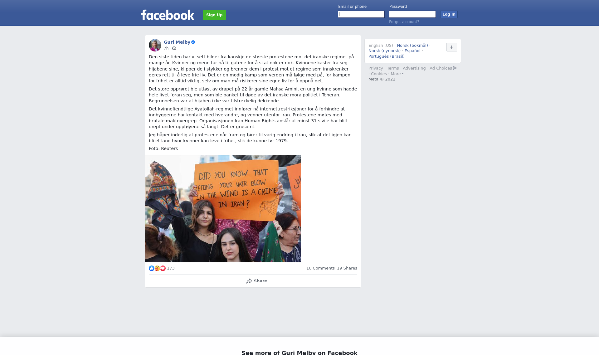 Den siste tiden har vi sett bilder fra kanskje de største protestene mot det iranske regimet på mange år. Kvinner og menn tar nå til gatene for å si at nok er nok. Kvinnene kaster fra seg hijabene sine, klipper de i stykker og brenner dem i protest mot et regime som innskrenker deres rett til å leve frie liv. Det er en modig kamp som verden må følge med på, for kampen for frihet er alltid viktig, selv om man må risikerer sine egne liv for å oppnå det.\n\nDet store opprøret ble utløst av drapet på 22 år gamle Mahsa Amini, en ung kvinne som hadde hele livet foran seg, men som ble banket til døde av det iranske moralpolitiet i Teheran. Begrunnelsen var at hijaben ikke var tilstrekkelig dekkende. \n\nDet kvinnefiendtlige Ayatollah-regimet innfører nå internettrestriksjoner for å forhindre at innbyggerne har kontakt med hverandre, og venner utenfor Iran. Protestene møtes med brutale maktovergrep. Organisasjonen Iran Human Rights anslår at minst 31 sivile har blitt drept under opptøyene så langt. Det er grusomt. \n\nJeg håper inderlig at protestene når fram og fører til varig endring i Iran, slik at det igjen kan bli et land hvor kvinner kan leve i frihet, slik de kunne før 1979.\n\nFoto: Reuters