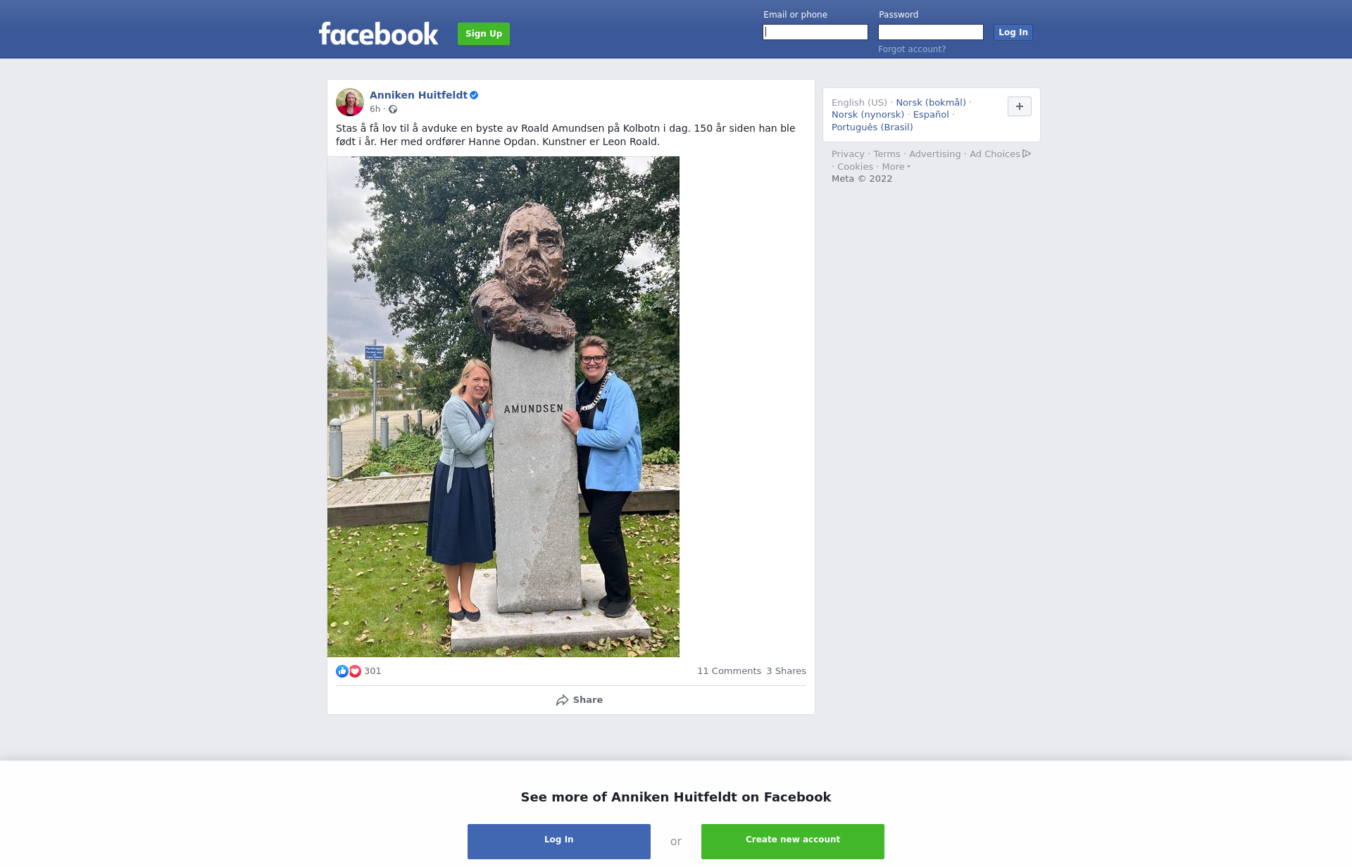 Stas å få lov til å avduke en byste av Roald Amundsen på Kolbotn i dag. 150 år siden han ble født i år. Her med ordfører Hanne Opdan. Kunstner er Leon Roald.