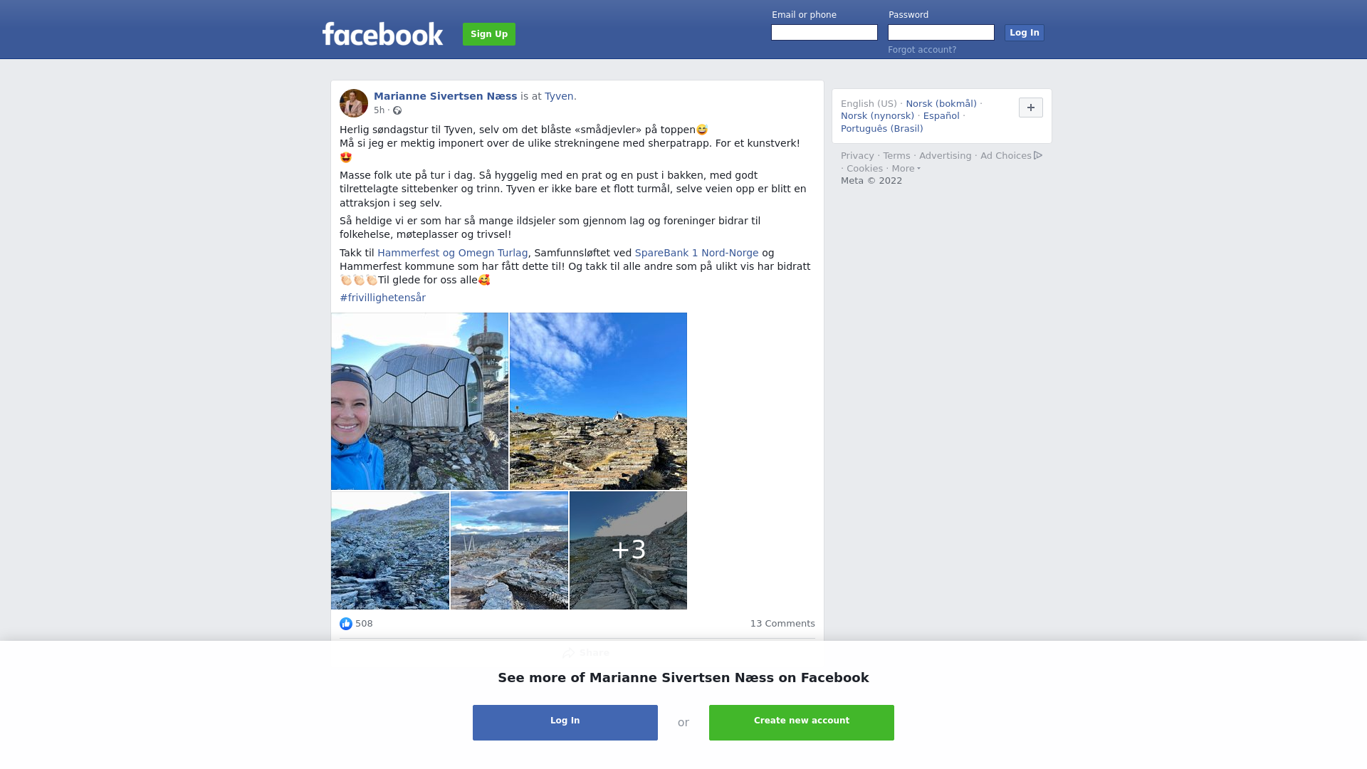 Herlig søndagstur til Tyven, selv om det blåste «smådjevler» på toppen😅\nMå si jeg er mektig imponert over de ulike strekningene med sherpatrapp. For et kunstverk! 😍 \n\nMasse folk ute på tur i dag. Så hyggelig med en prat og en pust i bakken, med godt tilrettelagte sittebenker og trinn. Tyven er ikke bare et flott turmål, selve veien opp er blitt en attraksjon i seg selv. \n\nSå heldige vi er som har så mange ildsjeler som gjennom lag og foreninger bidrar til folkehelse, møteplasser og trivsel! \n\nTakk til Hammerfest og Omegn Turlag, Samfunnsløftet ved SpareBank 1 Nord-Norge og Hammerfest kommune som har fått dette til! Og takk til alle andre som på ulikt vis har bidratt👏🏻👏🏻👏🏻Til glede for oss alle🥰\n\n#frivillighetensår