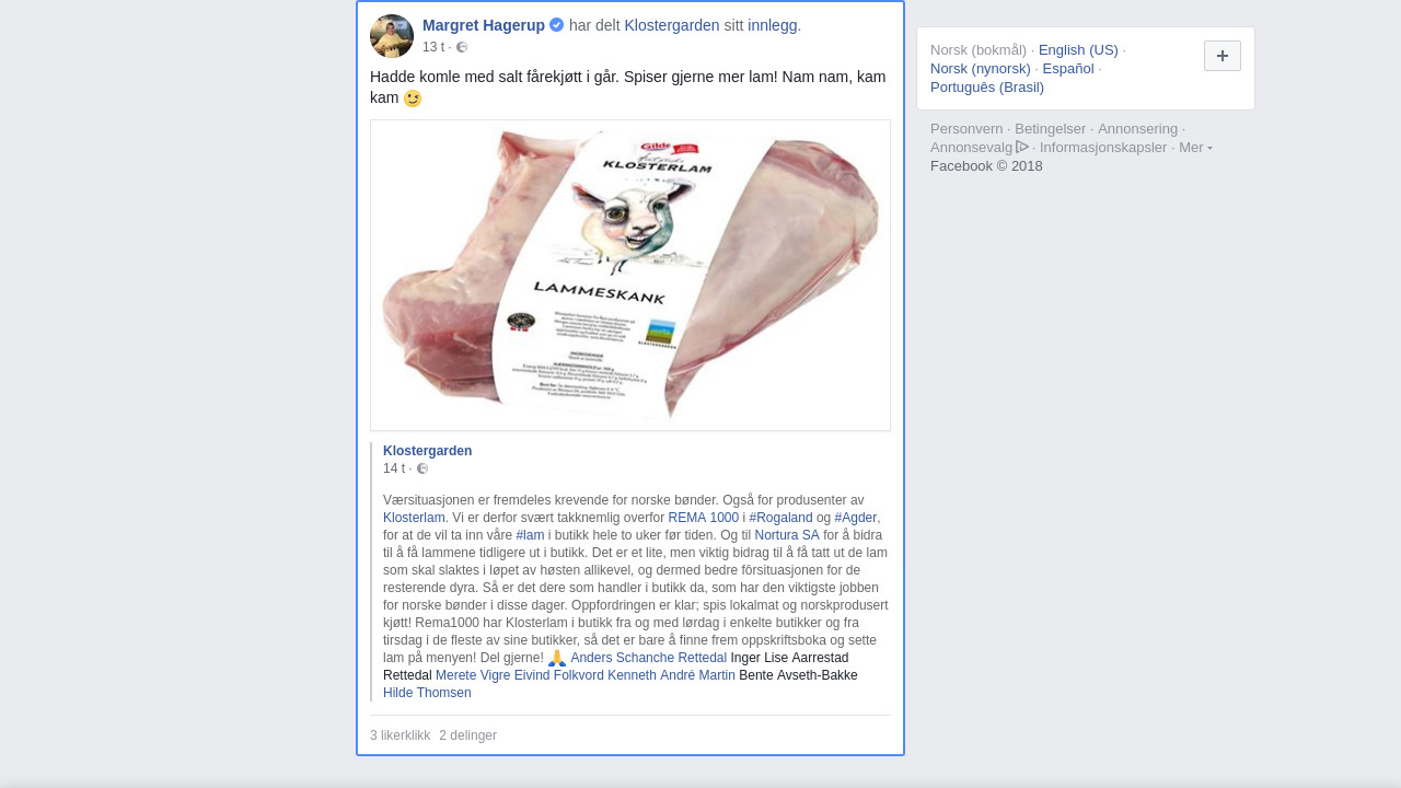 Værsituasjonen er fremdeles krevende for norske bønder. Også for produsenter av Klosterlam. Vi er derfor svært takknemlig overfor REMA 1000 i #Rogaland og #Agder, for at de vil ta inn våre #lam i butikk hele to uker før tiden. Og til Nortura SA for å bidra til å få lammene tidligere ut i butikk. Det er et lite, men viktig bidrag til å få tatt ut de lam som skal slaktes i løpet av høsten allikevel, og dermed bedre fôrsituasjonen for de resterende dyra. Så er det dere som handler i butikk da, som har den viktigste jobben for norske bønder i disse dager. Oppfordringen er klar; spis lokalmat og norskprodusert kjøtt! Rema1000 har Klosterlam i butikk fra og med lørdag i enkelte butikker og fra tirsdag i de fleste av sine butikker, så det er bare å finne frem oppskriftsboka og sette lam på menyen! Del gjerne! 🙏 Anders Schanche Rettedal Inger Lise Aarrestad Rettedal Merete Vigre Eivind Folkvord Kenneth André Martin Bente Avseth-Bakke Hilde Thomsen