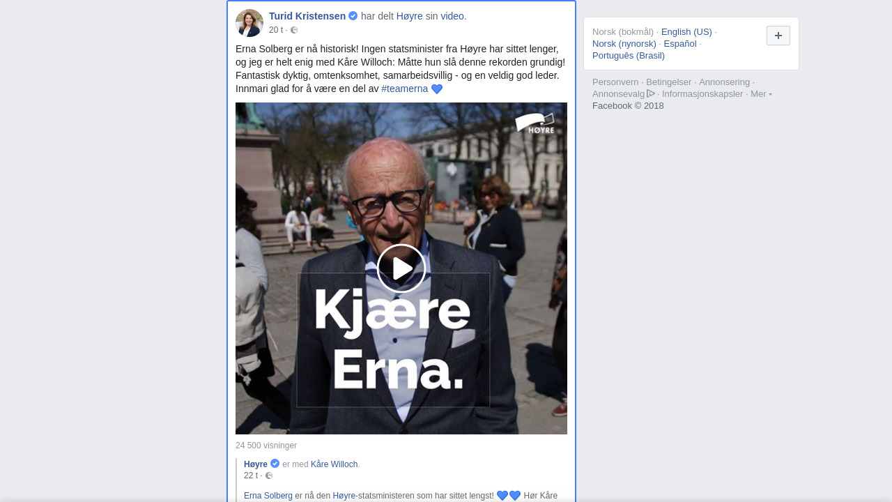 Erna Solberg er nå historisk! Ingen statsminister fra Høyre har sittet lenger, og jeg er helt enig med Kåre Willoch: Måtte hun slå denne rekorden grundig! Fantastisk dyktig, omtenksomhet, samarbeidsvillig - og en veldig god leder. Innmari glad for å være en del av #teamerna 💙