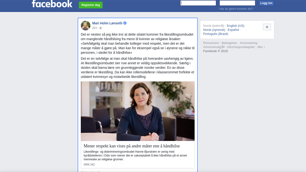 Det er nesten så jeg ikke tror at dette sitatet kommer fra likestillingsombudet om manglende håndhilsing fra menn til kvinner av religiøse årsaker: «Selvfølgelig skal man behandle kolleger med respekt, men det er det mange måter å gjøre på. Man kan for eksempel også se i øynene og nikke til personen, i stedet for å håndhilse»