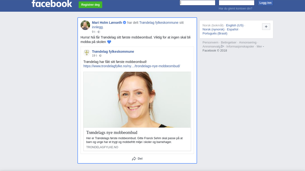 Trøndelag har fått sitt første mobbeombud! https://www.trondelagfylke.no/nyhetsarkiv/trondelags-nye-mobbeombud/