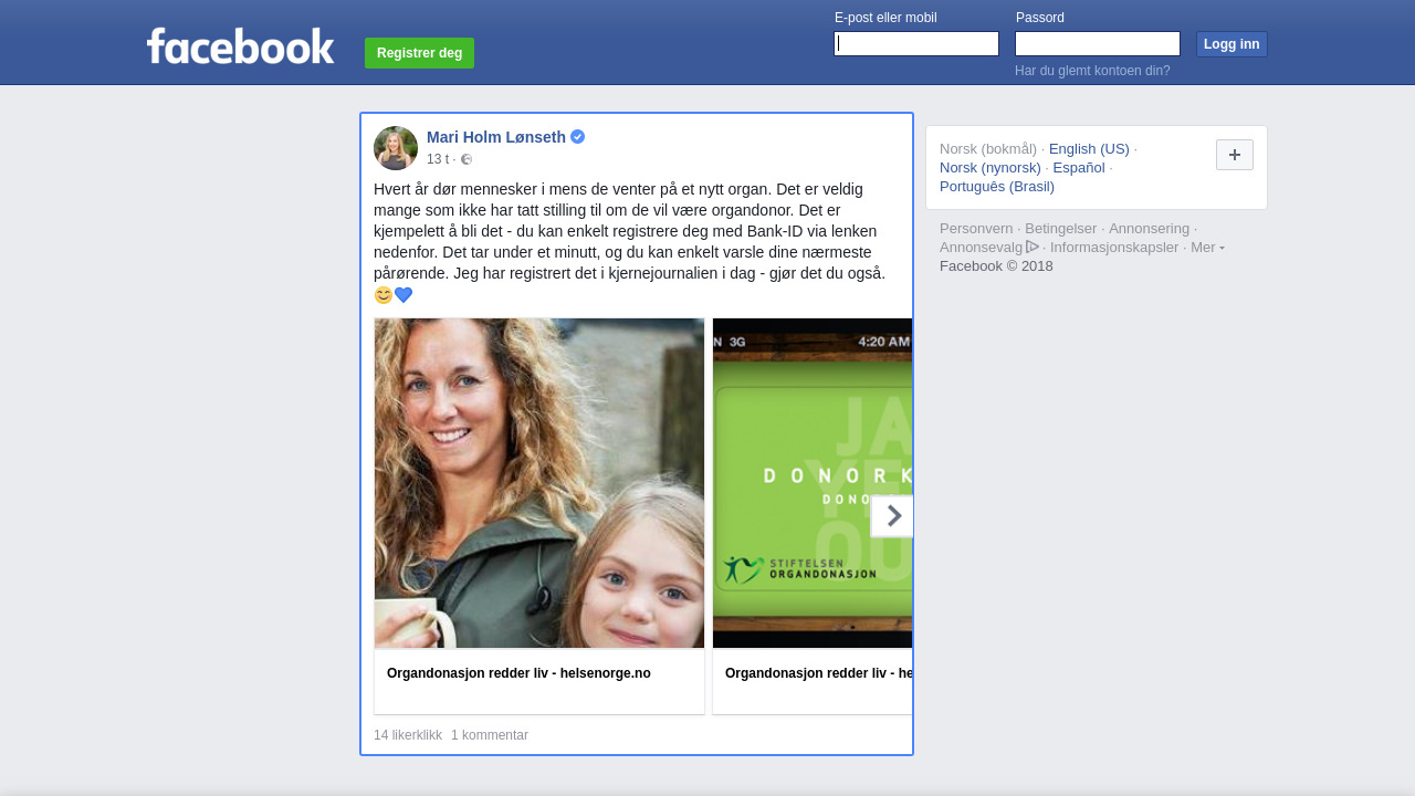 Hvert år dør mennesker i mens de venter på et nytt organ. Det er veldig mange som ikke har tatt stilling til om de vil være organdonor. Det er kjempelett å bli det - du kan enkelt registrere deg med Bank-ID via lenken nedenfor. Det tar under et minutt, og du kan enkelt varsle dine nærmeste pårørende. Jeg har registrert det i kjernejournalien i dag - gjør det du også. 😊💙
