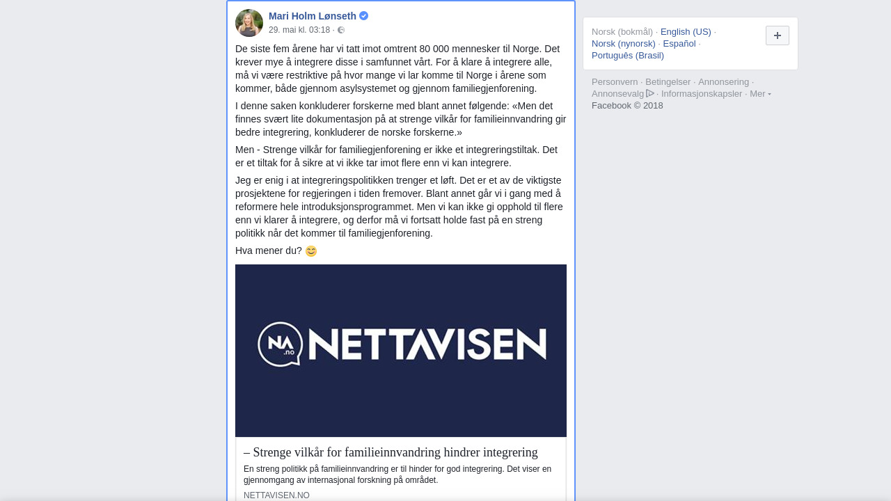 Men - Strenge vilkår for familiegjenforening er ikke et integreringstiltak. Det er et tiltak for å sikre at vi ikke tar imot flere enn vi kan integrere.