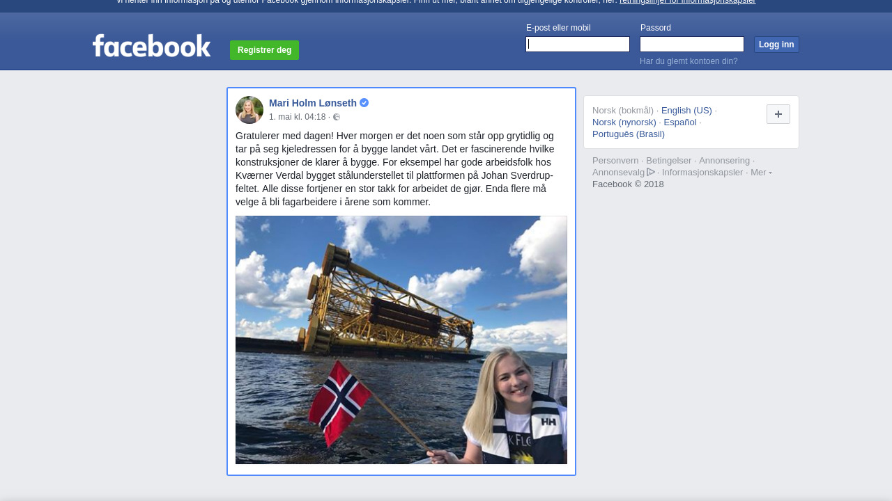 Gratulerer med dagen! Hver morgen er det noen som står opp grytidlig og tar på seg kjeledressen for å bygge landet vårt. Det er fascinerende hvilke konstruksjoner de klarer å bygge. For eksempel har gode arbeidsfolk hos Kværner Verdal bygget stålunderstellet til plattformen på Johan Sverdrup-feltet. Alle disse fortjener en stor takk for arbeidet de gjør. Enda flere må velge å bli fagarbeidere i årene som kommer.