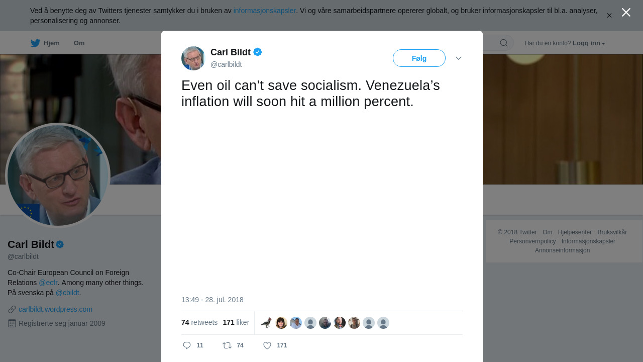 RT @carlbildt: Even oil can’t save socialism. Venezuela’s inflation will soon hit a million percent. https://t.co/n7Lxw9CLOd