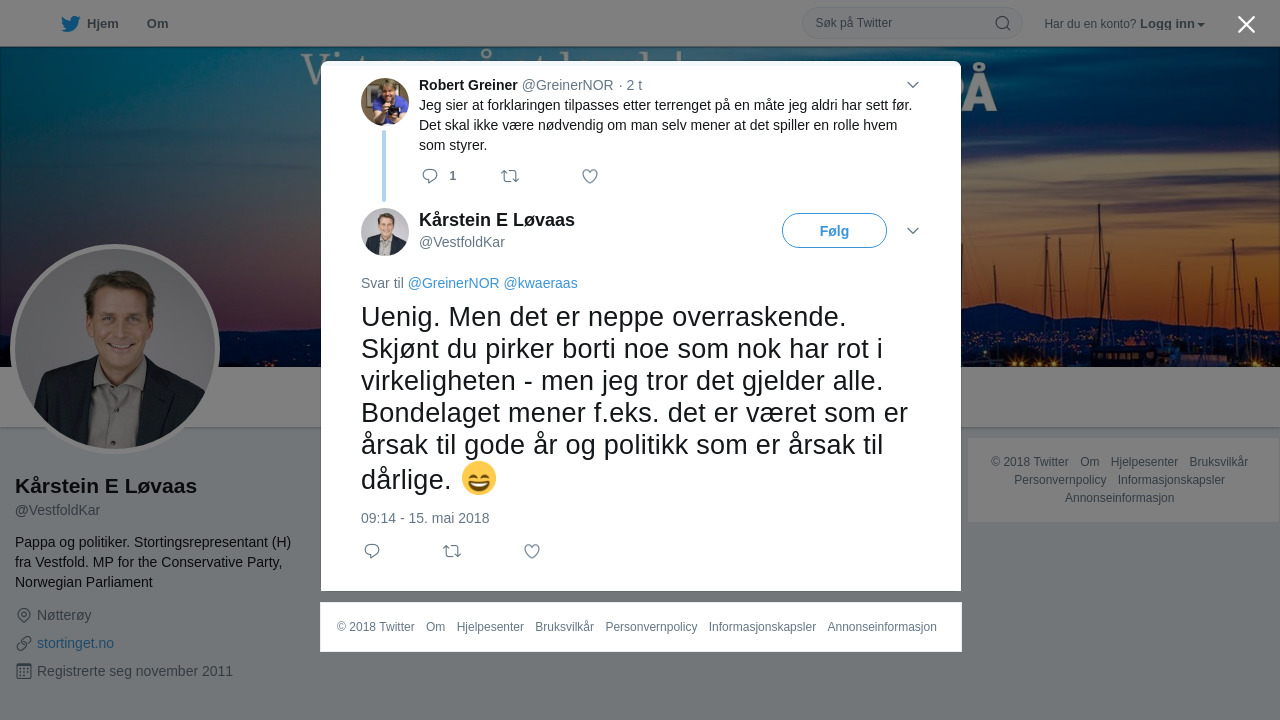@GreinerNOR @kwaeraas Uenig. Men det er neppe overraskende. Skjønt du pirker borti noe som nok har rot i virkeligheten - men jeg tror det gjelder alle. Bondelaget mener f.eks. det er været som er årsak til gode år og politikk som er årsak til dårlige. 😄