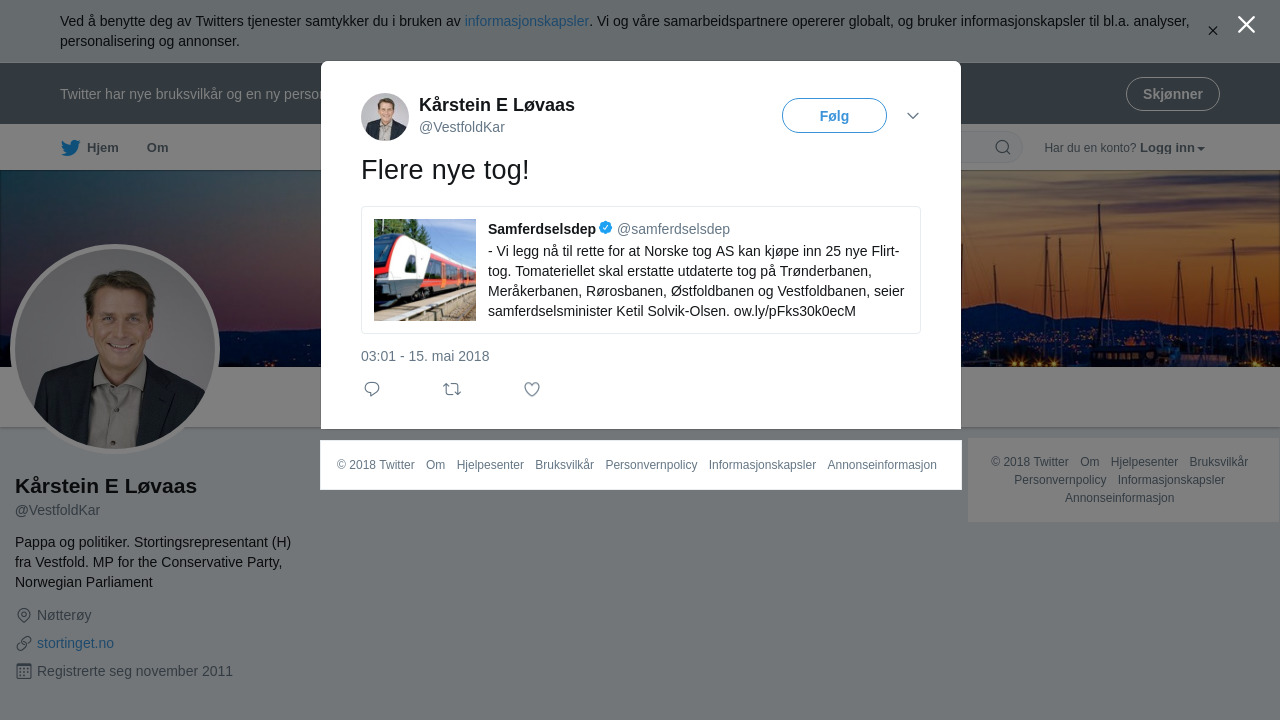 “- Vi legg nå til rette for at Norske tog AS kan kjøpe inn 25 nye Flirt-tog. Tomateriellet skal erstatte utdaterte tog på Trønderbanen, Meråkerbanen, Rørosbanen, Østfoldbanen og Vestfoldbanen, seier samferdselsminister Ketil Solvik-Olsen. https://t.co/NEsxoTN2UF #revidert2018”