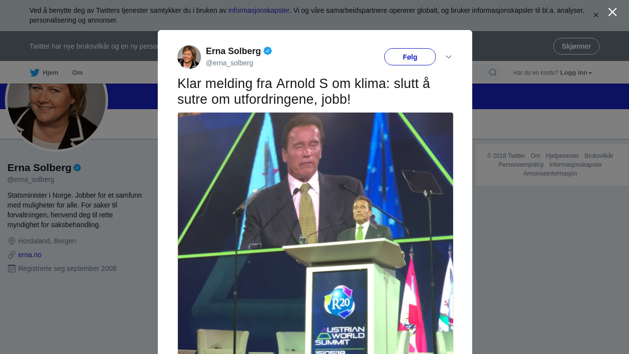 RT @erna_solberg: Klar melding fra Arnold S om klima: slutt å sutre om utfordringene, jobb! https://t.co/JP5YnLSeJE