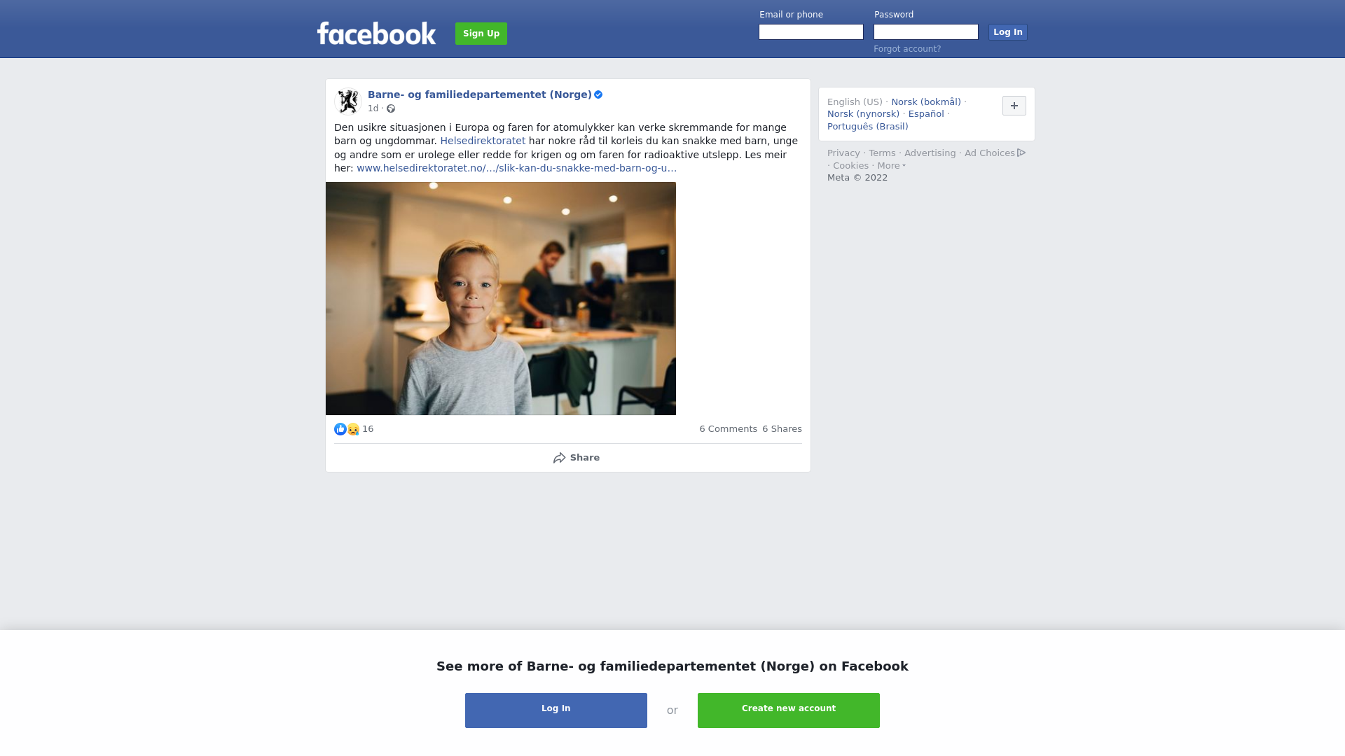 Den usikre situasjonen i Europa og faren for atomulykker kan verke skremmande for mange barn og ungdommar. Helsedirektoratet har nokre råd til korleis du kan snakke med barn, unge og andre som er urolege eller redde for krigen og om faren for radioaktive utslepp. Les meir her: www.helsedirektoratet.no/tema/psykososial-oppfolging-ved-ulykker-kriser-og-katastrofer/slik-kan-du-snakke-med-barn-og-ungdommar-om-krig-og-frykt-for-atomulykker