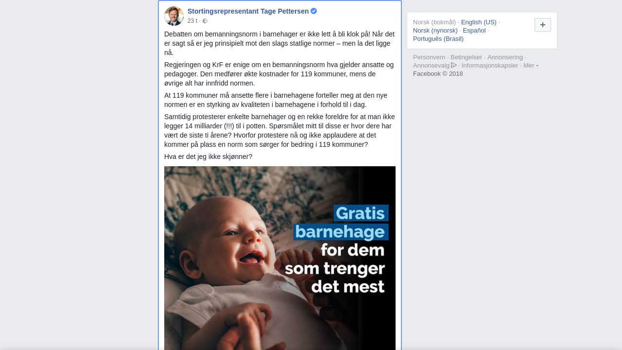 Samtidig protesterer enkelte barnehager og en rekke foreldre for at man ikke legger 14 milliarder (!!!) til i potten. Spørsmålet mitt til disse er hvor dere har vært de siste ti årene? Hvorfor protestere nå og ikke applaudere at det kommer på plass en norm som sørger for bedring i 119 kommuner?