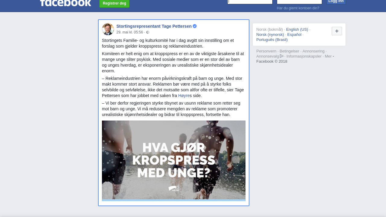 – Reklameindustrien har enorm påvirkningskraft på barn og unge. Med stor makt kommer stort ansvar. Reklamen bør være med på å styrke folks selvbilde og selvfølelse, ikke det motsatte som altfor ofte er tilfelle, sier Tage Pettersen som har jobbet med saken fra Høyres side.