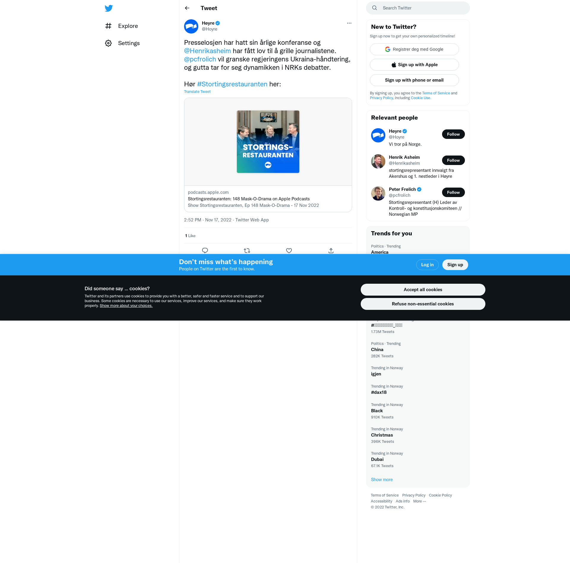 Presselosjen har hatt sin årlige konferanse og @Henrikasheim har fått lov til å grille journalistene. @pcfrolich vil granske regjeringens Ukraina-håndtering, og gutta tar for seg dynamikken i NRKs debatter.\n\nHør #Stortingsrestauranten her: https://t.co/TGMygXtNTd