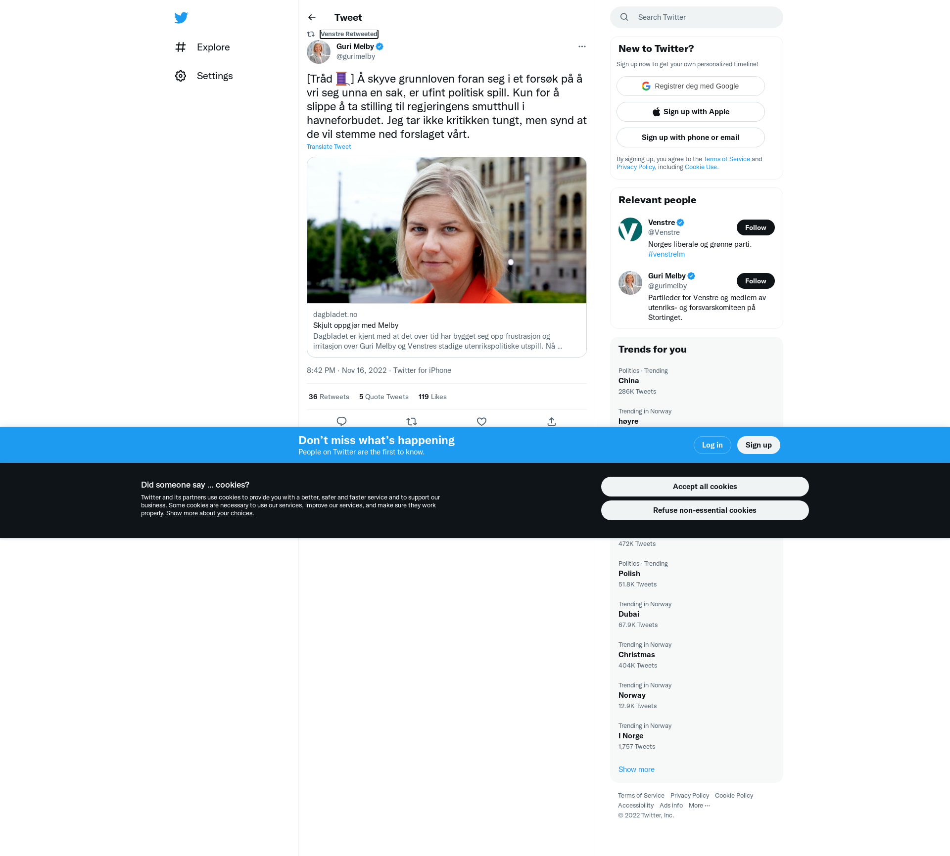 RT @gurimelby: [Tråd 🧵] Å skyve grunnloven foran seg i et forsøk på å vri seg unna en sak, er ufint politisk spill. Kun for å slippe å ta stilling til regjeringens smutthull i havneforbudet. Jeg tar ikke kritikken tungt, men synd at de vil stemme ned forslaget vårt.\nhttps://t.co/0rj801bJ8n