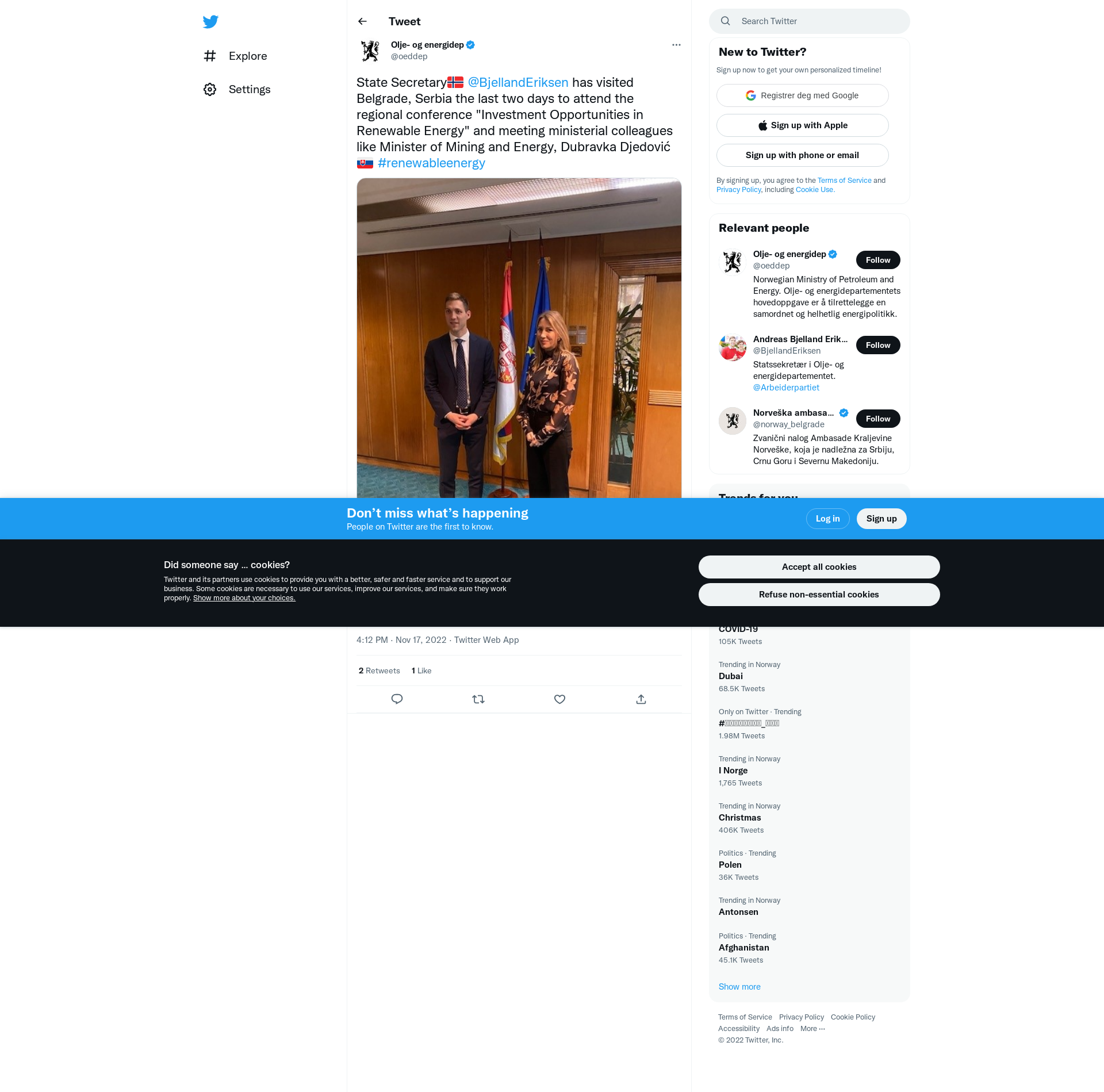 State Secretary🇳🇴 @BjellandEriksen has visited Belgrade, Serbia the last two days to attend the regional conference "Investment Opportunities in Renewable Energy" and meeting ministerial colleagues like Minister of Mining and Energy, Dubravka Djedović🇸🇰 #renewableenergy https://t.co/5wnWZ3NphL