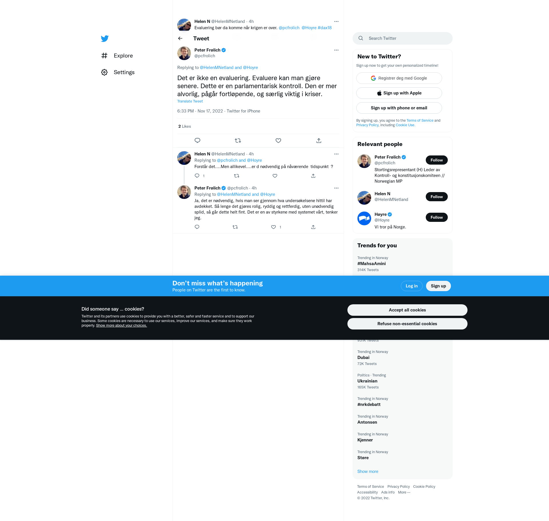@HelenMNetland @Hoyre Det er ikke en evaluering. Evaluere kan man gjøre senere. Dette er en parlamentarisk kontroll. Den er mer alvorlig, pågår fortløpende, og særlig viktig i kriser.