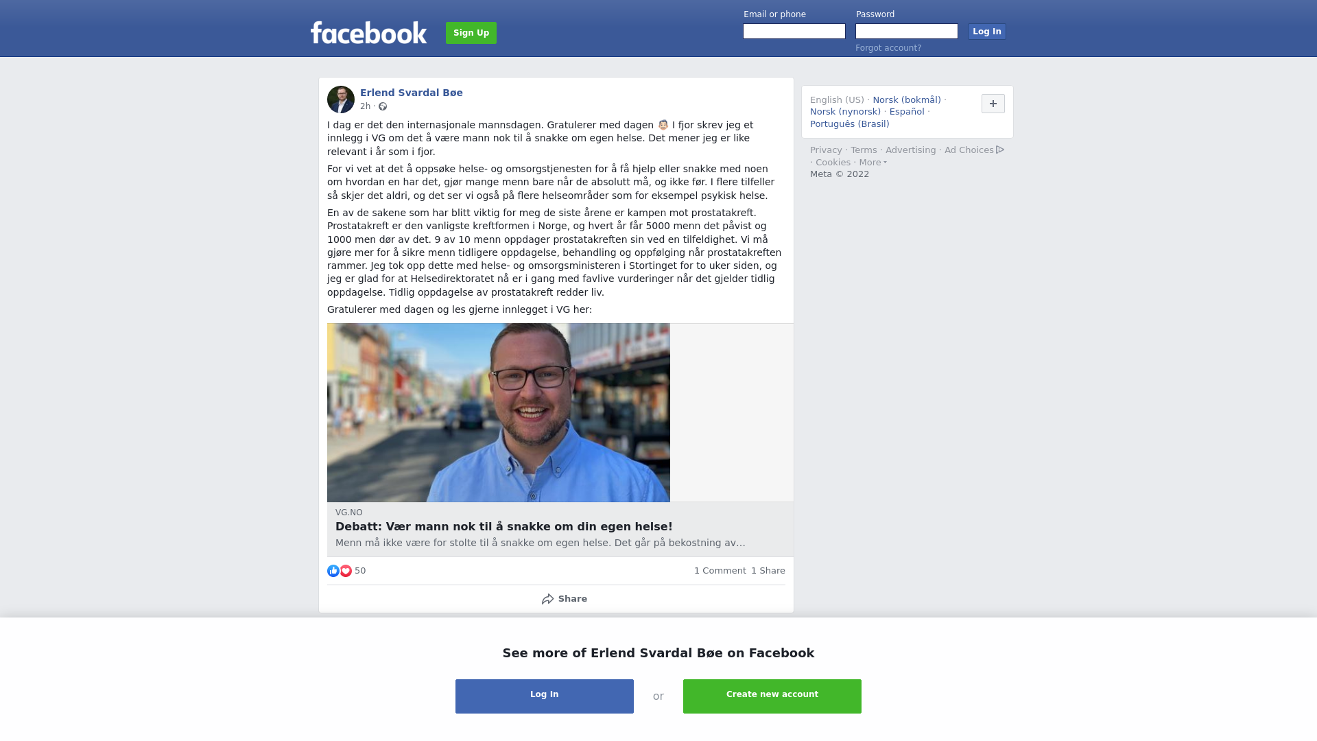 I dag er det den internasjonale mannsdagen. Gratulerer med dagen 👨🏻 I fjor skrev jeg et innlegg i VG om det å være mann nok til å snakke om egen helse. Det mener jeg er like relevant i år som i fjor. \n\nFor vi vet at det å oppsøke helse- og omsorgstjenesten for å få hjelp eller snakke med noen om hvordan en har det, gjør mange menn bare når de absolutt må, og ikke før. I flere tilfeller så skjer det aldri, og det ser vi også på flere helseområder som for eksempel psykisk helse. \n\nEn av de sakene som har blitt viktig for meg de siste årene er kampen mot prostatakreft. Prostatakreft er den vanligste kreftformen i Norge, og hvert år får 5000 menn det påvist og 1000 men dør av det. 9 av 10 menn oppdager prostatakreften sin ved en tilfeldighet. Vi må gjøre mer for å sikre menn tidligere oppdagelse, behandling og oppfølging når prostatakreften rammer. Jeg tok opp dette med helse- og omsorgsministeren i Stortinget for to uker siden, og jeg er glad for at Helsedirektoratet nå er i gang med favlive vurderinger når det gjelder tidlig oppdagelse. Tidlig oppdagelse av prostatakreft redder liv.\n\nGratulerer med dagen og les gjerne innlegget i VG her: