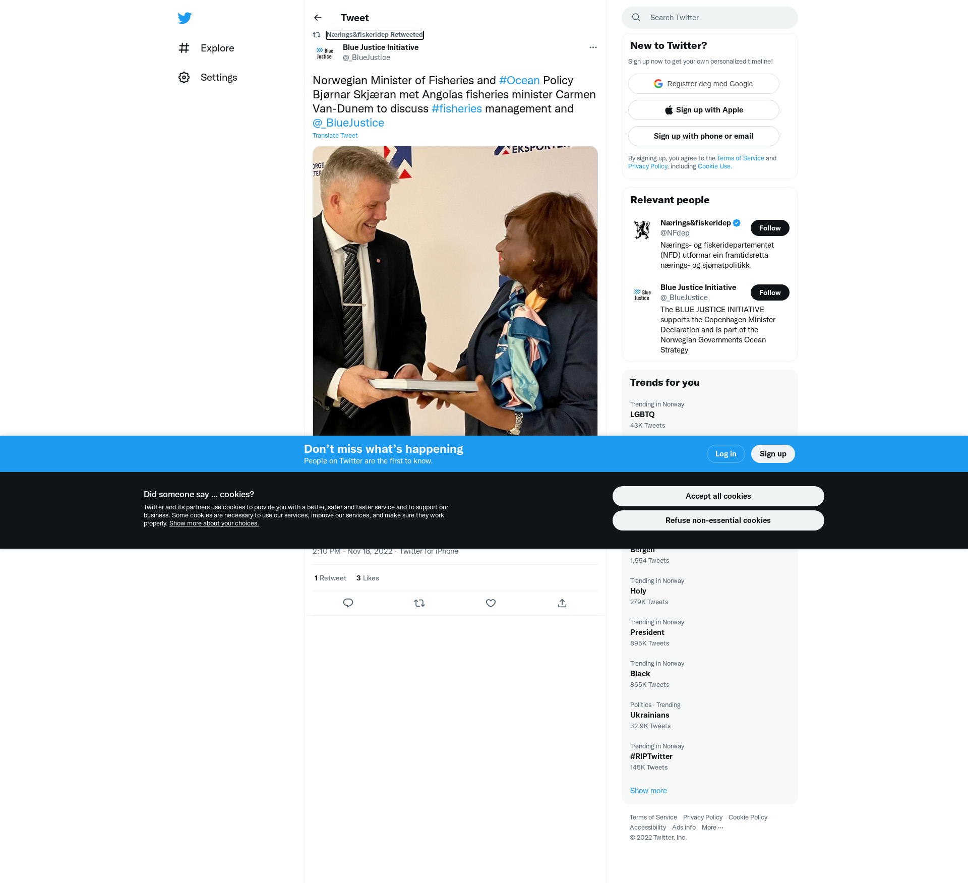 RT @_BlueJustice: Norwegian Minister of Fisheries and #Ocean Policy Bjørnar Skjæran met Angolas fisheries minister Carmen Van-Dunem to discuss #fisheries management and @_BlueJustice https://t.co/sEw3N6Bnh8