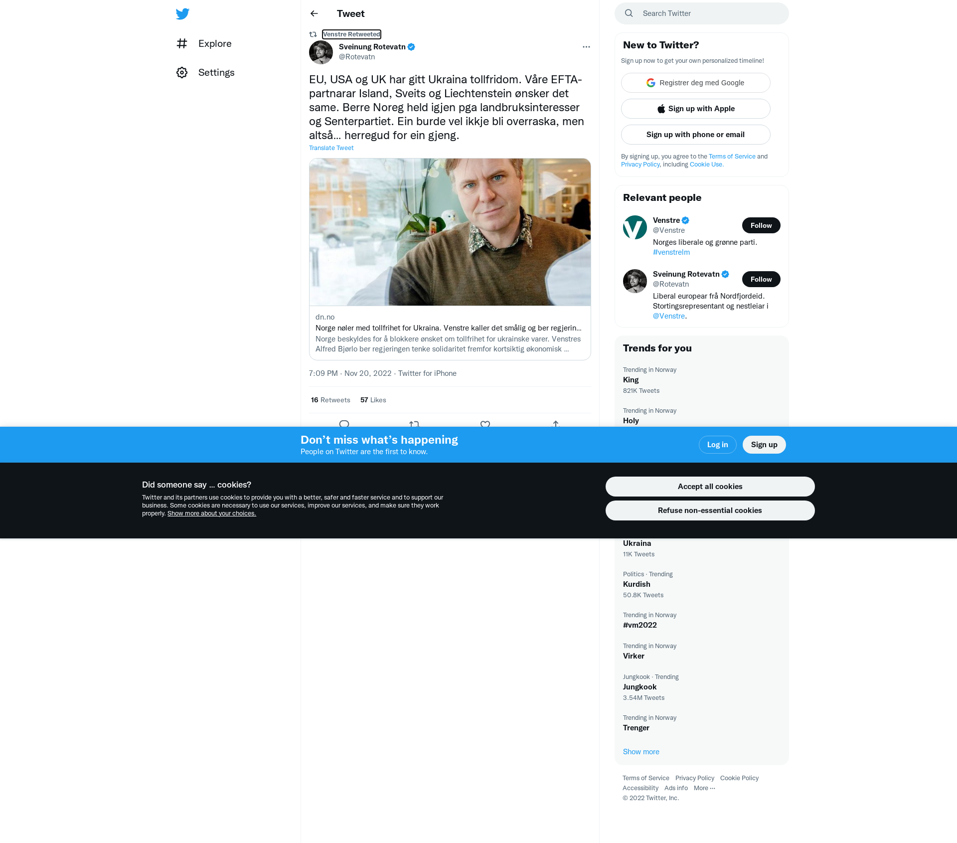 RT @Rotevatn: EU, USA og UK har gitt Ukraina tollfridom. Våre EFTA-partnarar Island, Sveits og Liechtenstein ønsker det same. Berre Noreg held igjen pga landbruksinteresser og Senterpartiet. Ein burde vel ikkje bli overraska, men altså… herregud for ein gjeng. \n\nhttps://t.co/HXSSlZ8yAR