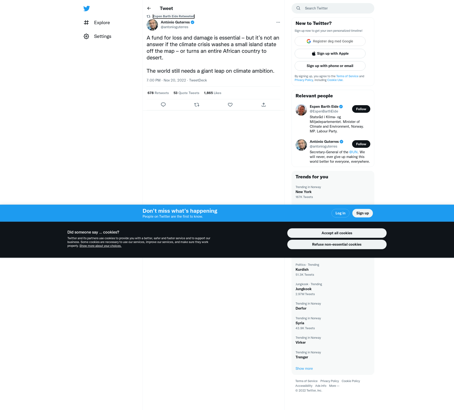 RT @antonioguterres: A fund for loss and damage is essential – but it’s not an answer if the climate crisis washes a small island state off the map – or turns an entire African country to desert.\n\nThe world still needs a giant leap on climate ambition.