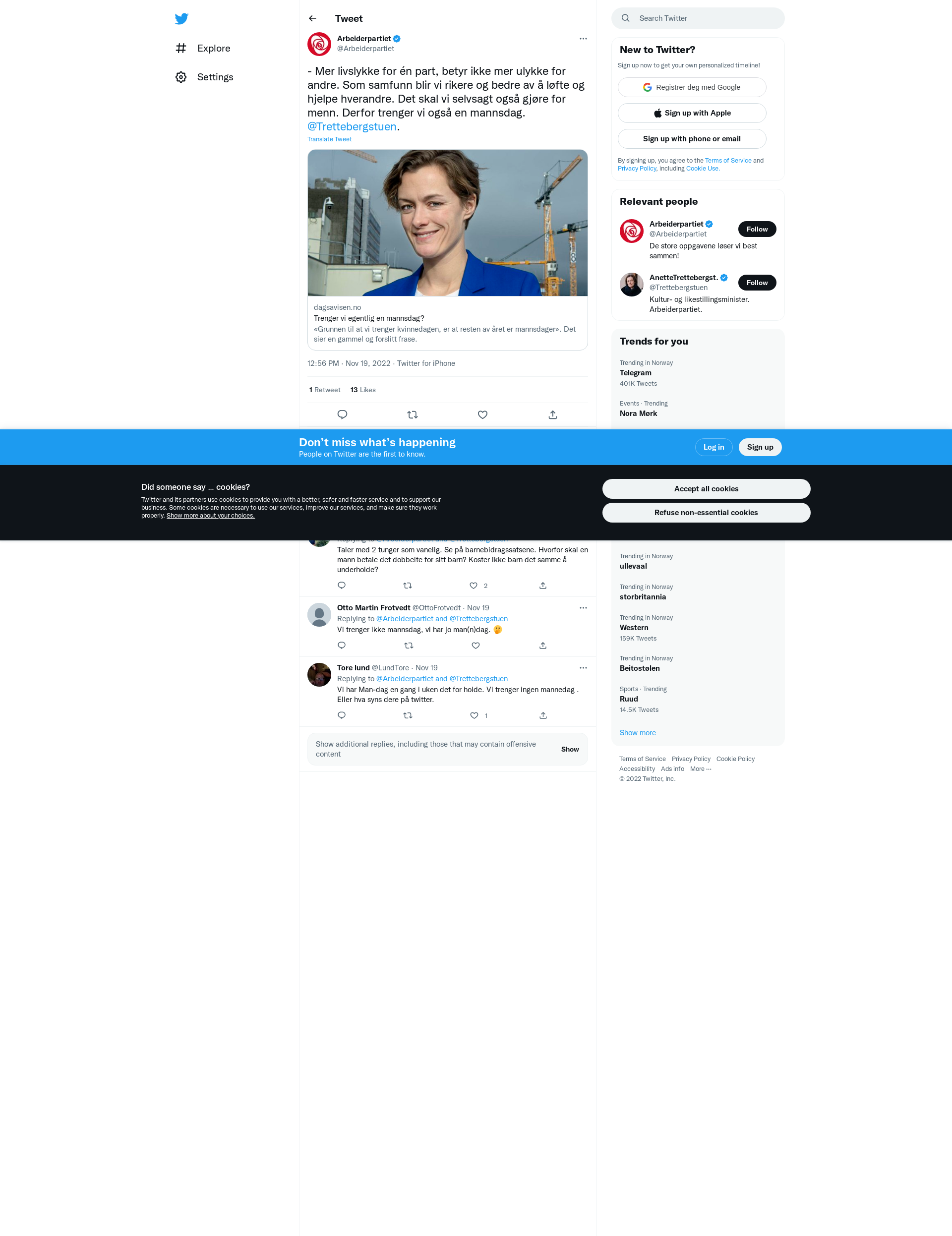 - Mer livslykke for én part, betyr ikke mer ulykke for andre. Som samfunn blir vi rikere og bedre av å løfte og hjelpe hverandre. Det skal vi selvsagt også gjøre for menn. Derfor trenger vi også en mannsdag. @Trettebergstuen.https://t.co/CHwfJyJpRR