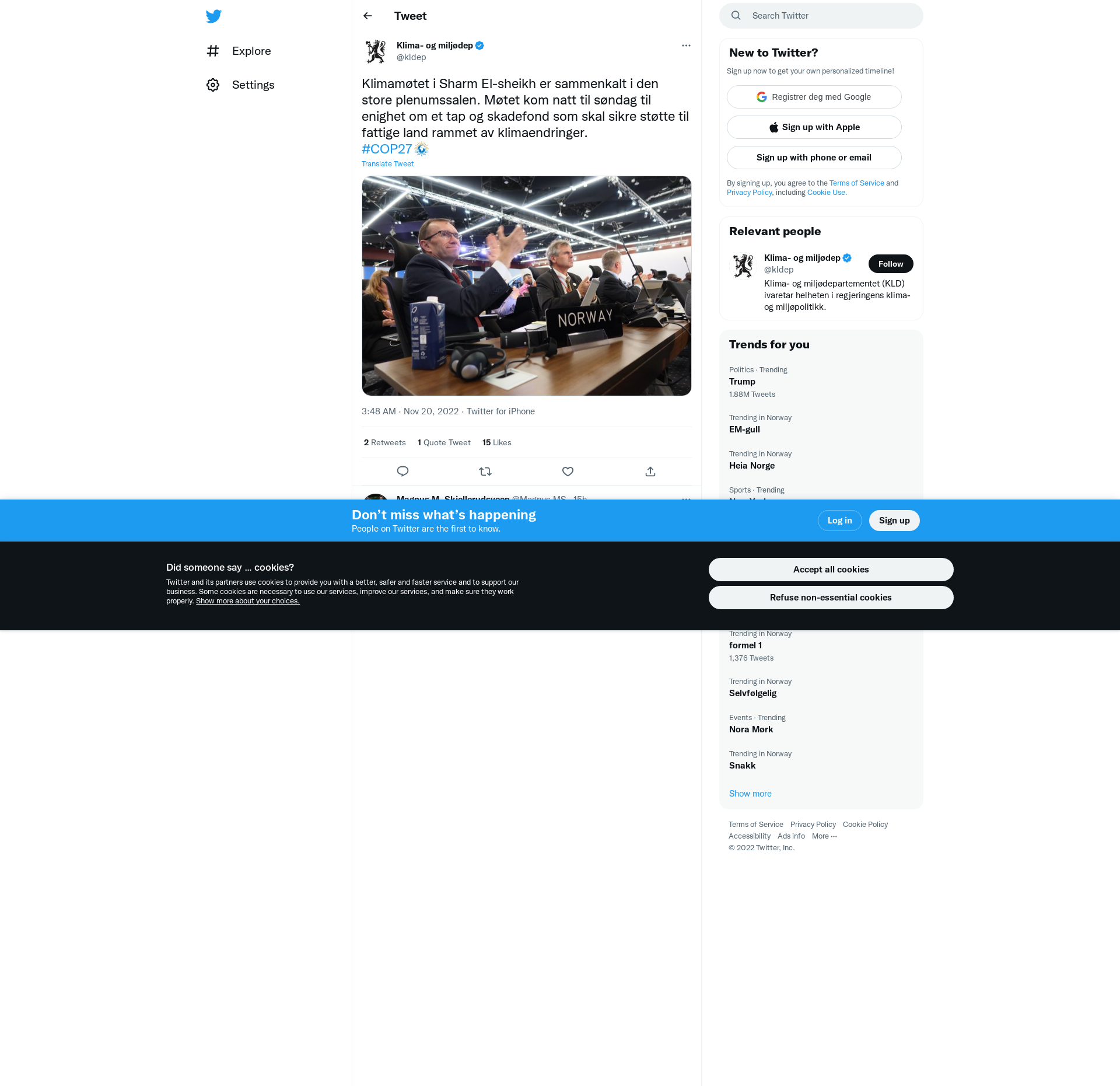 Klimamøtet i Sharm El-sheikh er sammenkalt i den store plenumssalen. Møtet kom natt til søndag til enighet om et tap og skadefond som skal sikre støtte til fattige land rammet av klimaendringer.\n#COP27 https://t.co/sEuiLWZsX0