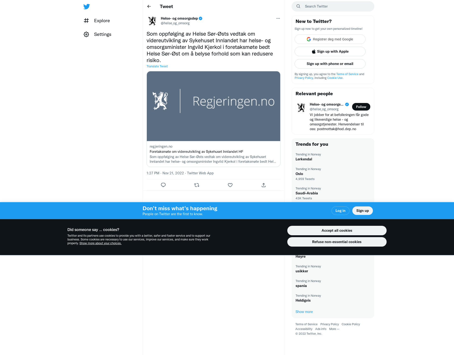 Som oppfølging av Helse Sør-Østs vedtak om videreutvikling av Sykehuset Innlandet har helse- og omsorgsminister Ingvild Kjerkol i foretaksmøte bedt Helse Sør-Øst om å belyse forhold som kan redusere risiko. Dette må gjøres før foretaksmøte kan ta still...