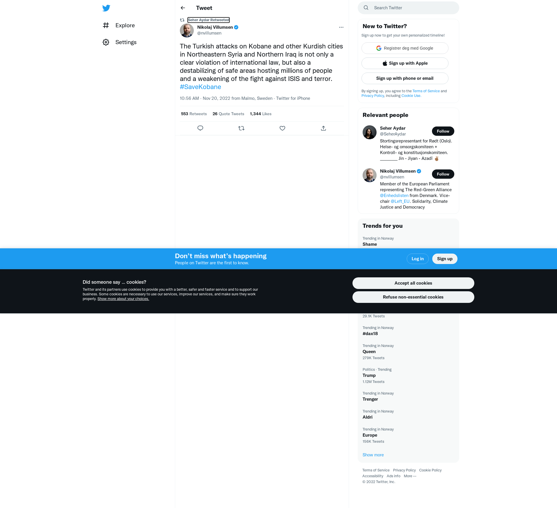 RT @nvillumsen: The Turkish attacks on Kobane and other Kurdish cities in Northeastern Syria and Northern Iraq is not only a clear violation of international law, but also a destabilizing of safe areas hosting millions of people and a weakening of the fight against ISIS and terror. #SaveKobane