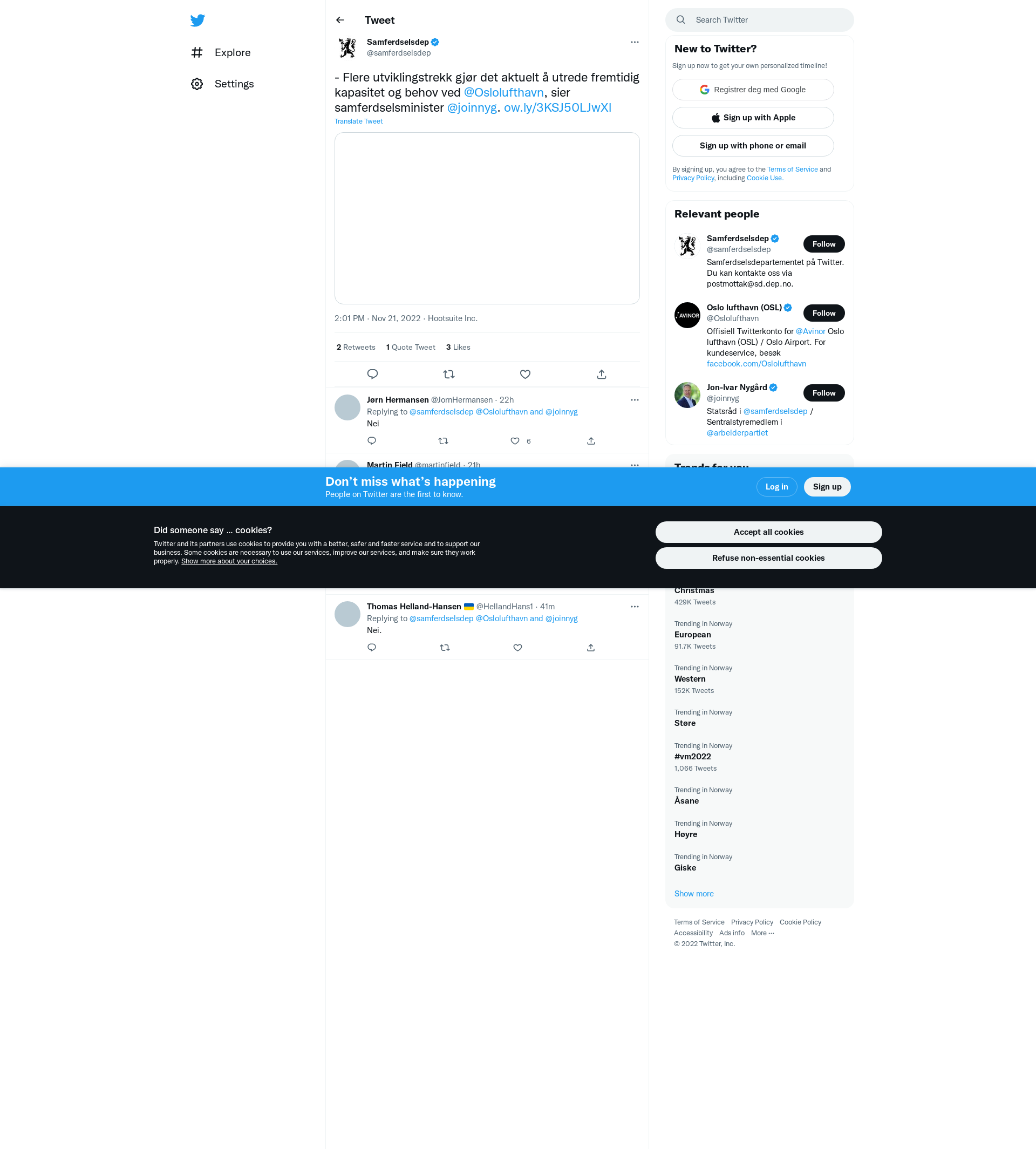 - Flere utviklingstrekk gjør det aktuelt å utrede fremtidig kapasitet og behov ved @Oslolufthavn, sier samferdselsminister @joinnyg. https://t.co/Zi5TJgSCgF https://t.co/Fr1pMMueJX