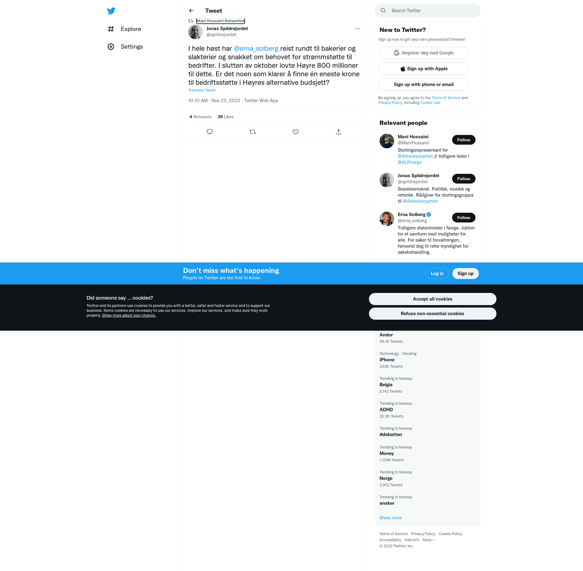 RT @spildrejordet: I hele høst har @erna_solberg reist rundt til bakerier og slakterier og snakket om behovet for strømmstøtte til bedrifter. I slutten av oktober lovte Høyre 800 millioner til dette. Er det noen som klarer å finne én eneste krone til bedriftsstøtte i Høyres alternative budsjett?