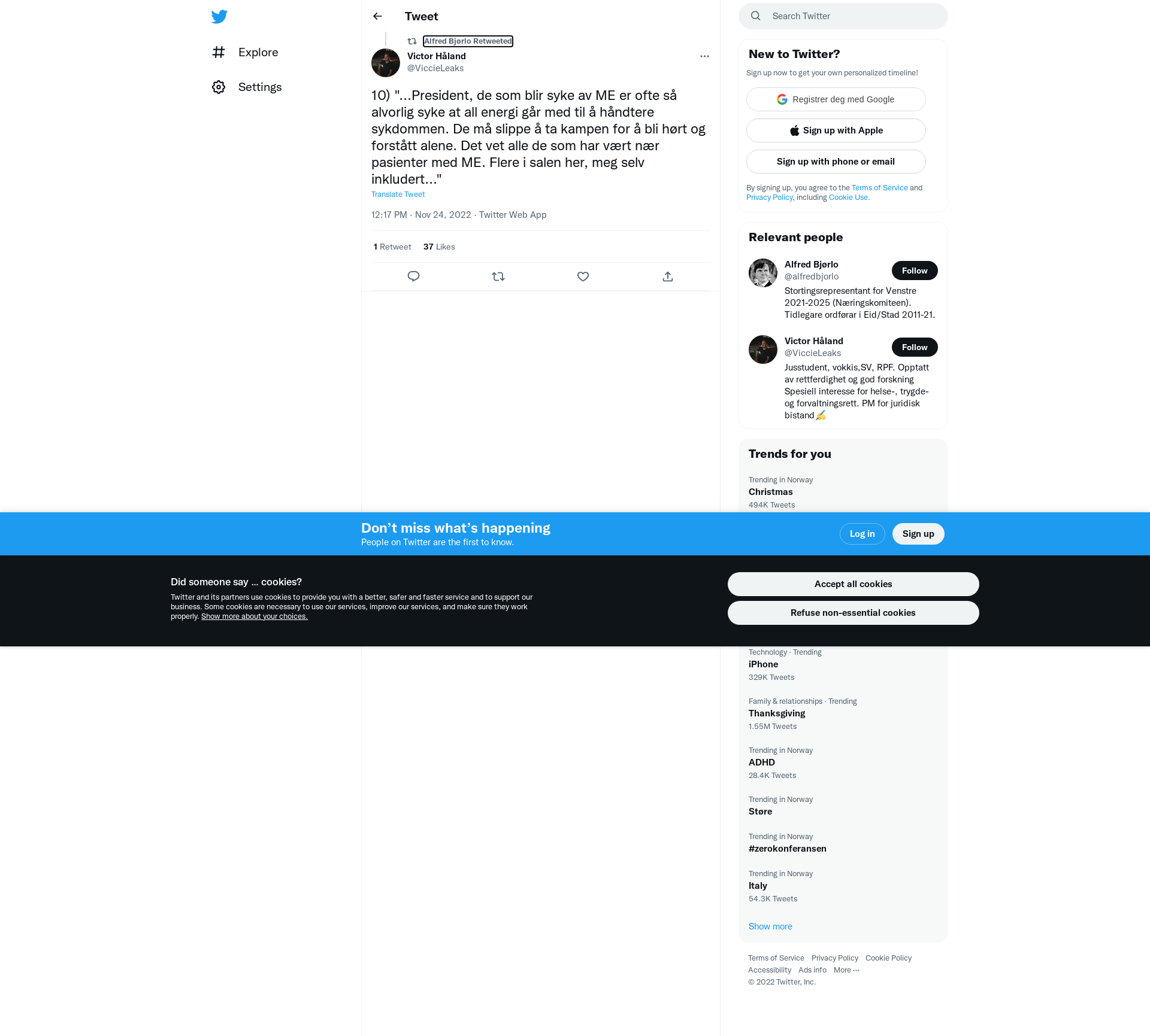 RT @ViccieLeaks: 10) "...President, de som blir syke av ME er ofte så alvorlig syke at all energi går med til å håndtere sykdommen. De må slippe å ta kampen for å bli hørt og forstått alene. Det vet alle de som har vært nær pasienter med ME. Flere i salen her, meg selv inkludert..."