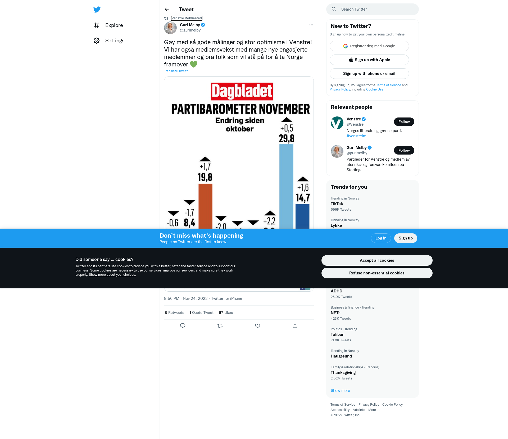 RT @gurimelby: Gøy med så gode målinger og stor optimisme i Venstre! Vi har også medlemsvekst med mange nye engasjerte medlemmer og bra folk som vil stå på for å ta Norge framover 💚 https://t.co/ktu0TfK9Ic