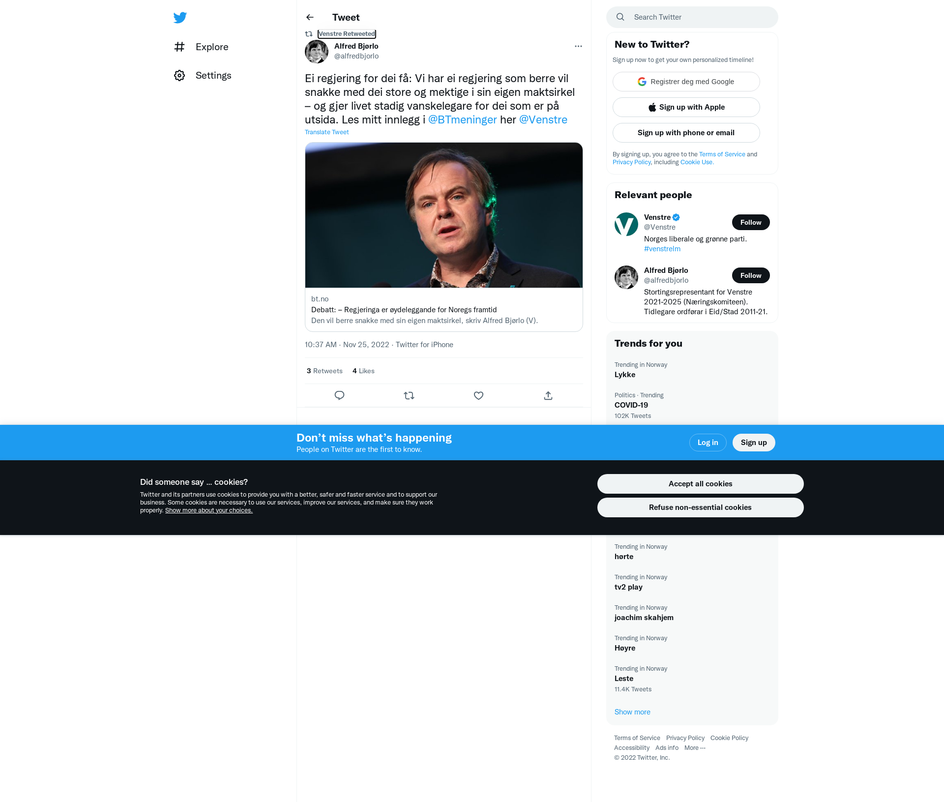 RT @alfredbjorlo: Ei regjering for dei få: Vi har ei regjering som berre vil snakke med dei store og mektige i sin eigen maktsirkel – og gjer livet stadig vanskelegare for dei som er på utsida. Les mitt innlegg i @BTmeninger her @Venstre \nhttps://t.co/6JUdtthpcJ